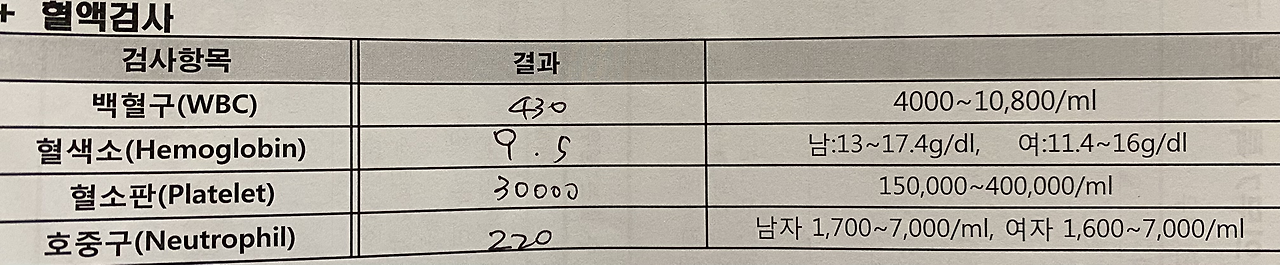 두번째 피검사 결과가.. 혈소판이 더 떨어져서 수혈처방을 받았다.
