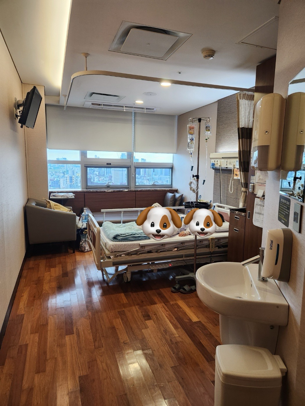 춥고 더우면 냉난방을 맘대로 조절할 수 있고, 화장실 순서를 기다리지 않아도 언제든지 갈 수 있으며, 티브이도 볼 수 있고 보호자 침대도 응급실 카약침대 세배는 되어 보였다.