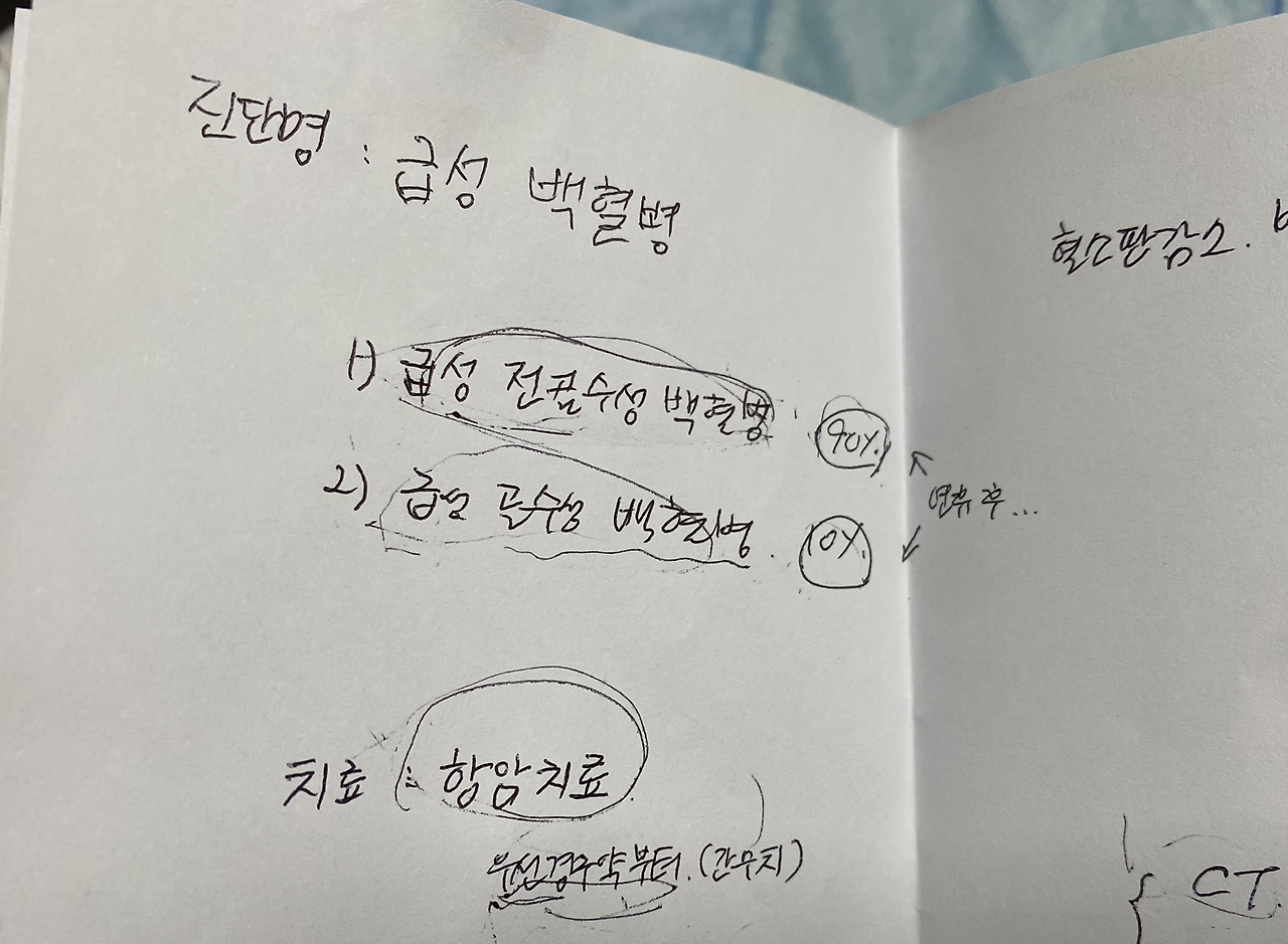 “원인은 딱히 없습니다. 그래서 급성인 거고 그나마 다행히 급성 전골수성 백혈병(APL)과 급성 골수성 백혈병(AML)이 있는데..(뒤에 설명이 기억이 안 난다..) 치료 시기가 늦지 않게 오셨고… (뒤에 말이 기억이 안난다.)”