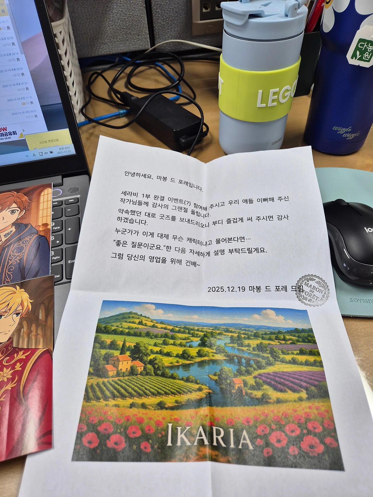 며칠 전 마봉 드 포레 작가님께서 쓰고 계신 소설 <장하다, 세라비!> 1부 완결 기념으로 이벤트를 여셨다.