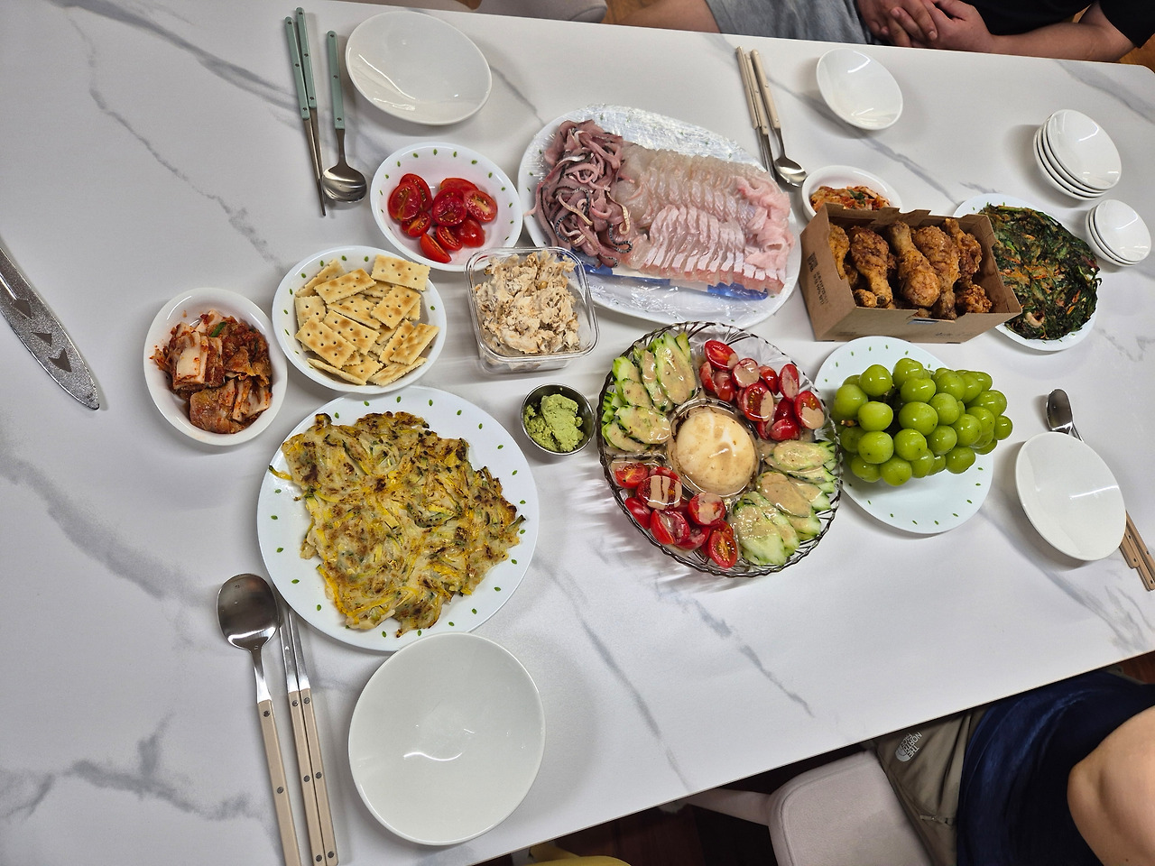 "앉아 계세요. 이제 LA 갈비만 구우면 돼요." "여기 뭐 횟집이에요?" 남편이 좋아하는 전어회와 광어회가 수북이 나왔다. 나는 회를 안 먹어서 맛도 모르건만, 나 빼고 다들 신났다.