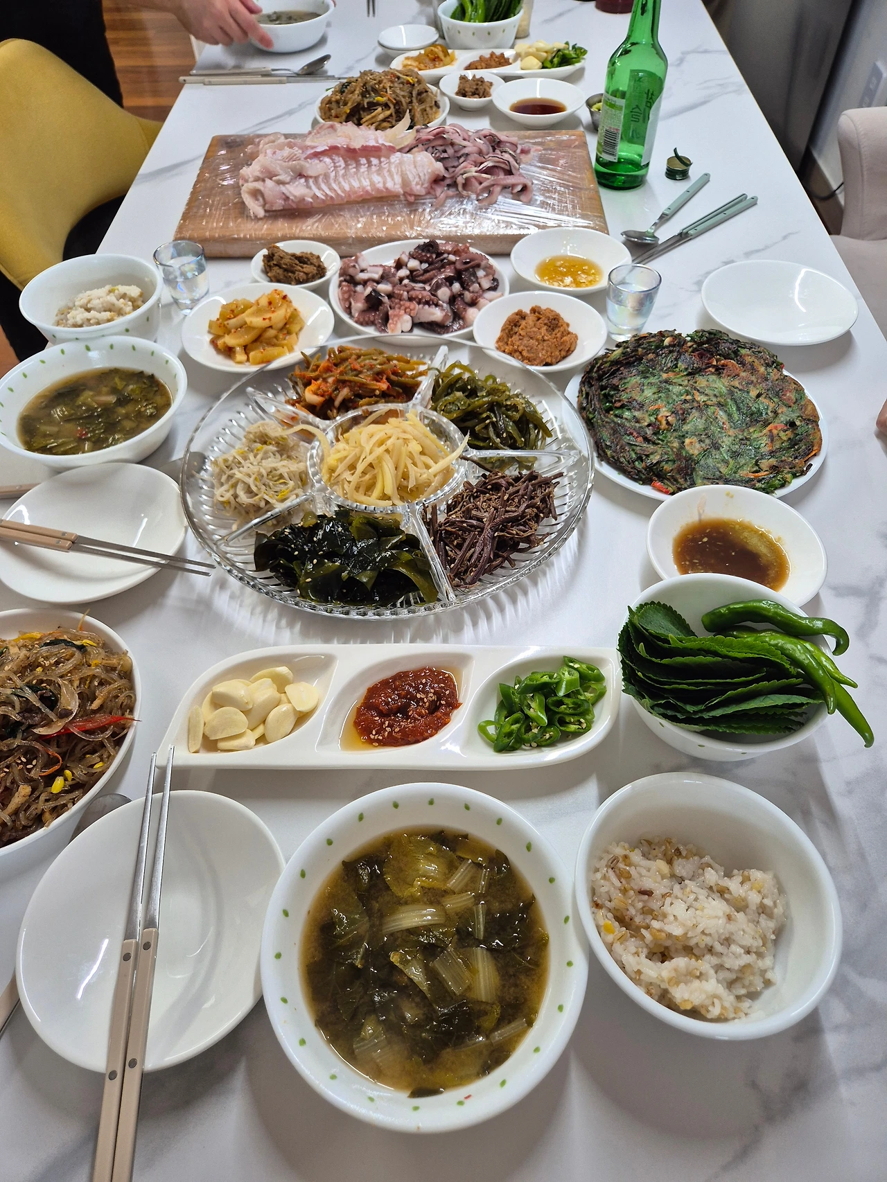 저녁 시간, 새언니의 화려한 저녁상이 차려졌다. 볼 때마다 마음의 준비를 하건만, 이번에도 눈이 휘둥그레졌다. 집에서 요리도 안 하고, 일 돕는 솜씨도 그다지 없는 나는 매번 안절부절못한다. "이제 그... 그만. 이거 다 못 먹어요."