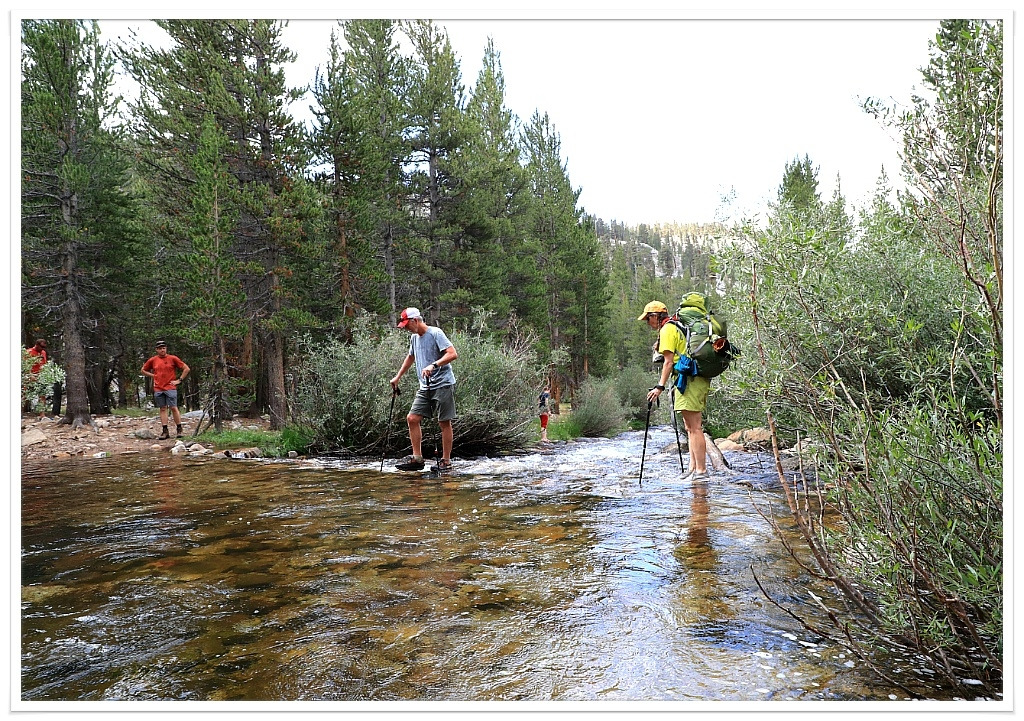 8시 출발은 캠핑장 앞 개울을 건너면서 시작된다. 어제는 갈림길에서 오른쪽 길로 휘트니를 다녀왔고 오늘은 왼쪽 길로 본격적인 JMT가 시작된다. 0.8마일을 걷고 삼거리를 만나면 JMT, PCT길은 오른쪽 길로 이어진다. 완만한 트레일 길에 세콰이어 숲길이 이어진다. 서부 카우보이 모자를 쓴 마부가 말 5 필을 몰고 내려오는 말등에는 트레일러의 짐을 싣고 있다. 이곳의 유일한 운송 수단은 말이 그 역할을 한다. 자연과 말 그리고 마부 모두가 이곳 풍경과 잘 어울린다. 이 지역이 서부의 골든러시를 이루던 개척시대 서부의 땅이다. 개울을 건너는데 계곡물이 많이 불어 있다. 지난겨울에 내린 눈이 녹아 개울물이 많이 높아졌다. 개울을 건너는 데는 다리는 보이지 않는다. 목이 짧은 트레일화를 신은 트레커들은 신발을 벗고 신발끈을 묶어 목에 걸고 건너고 목이 긴 등산화를 신은 트레커는 물에 잠긴 징검다리를 딛고 빠르게 건넌다. 존 뮤어 다운 개울을 건너는 맛이다.