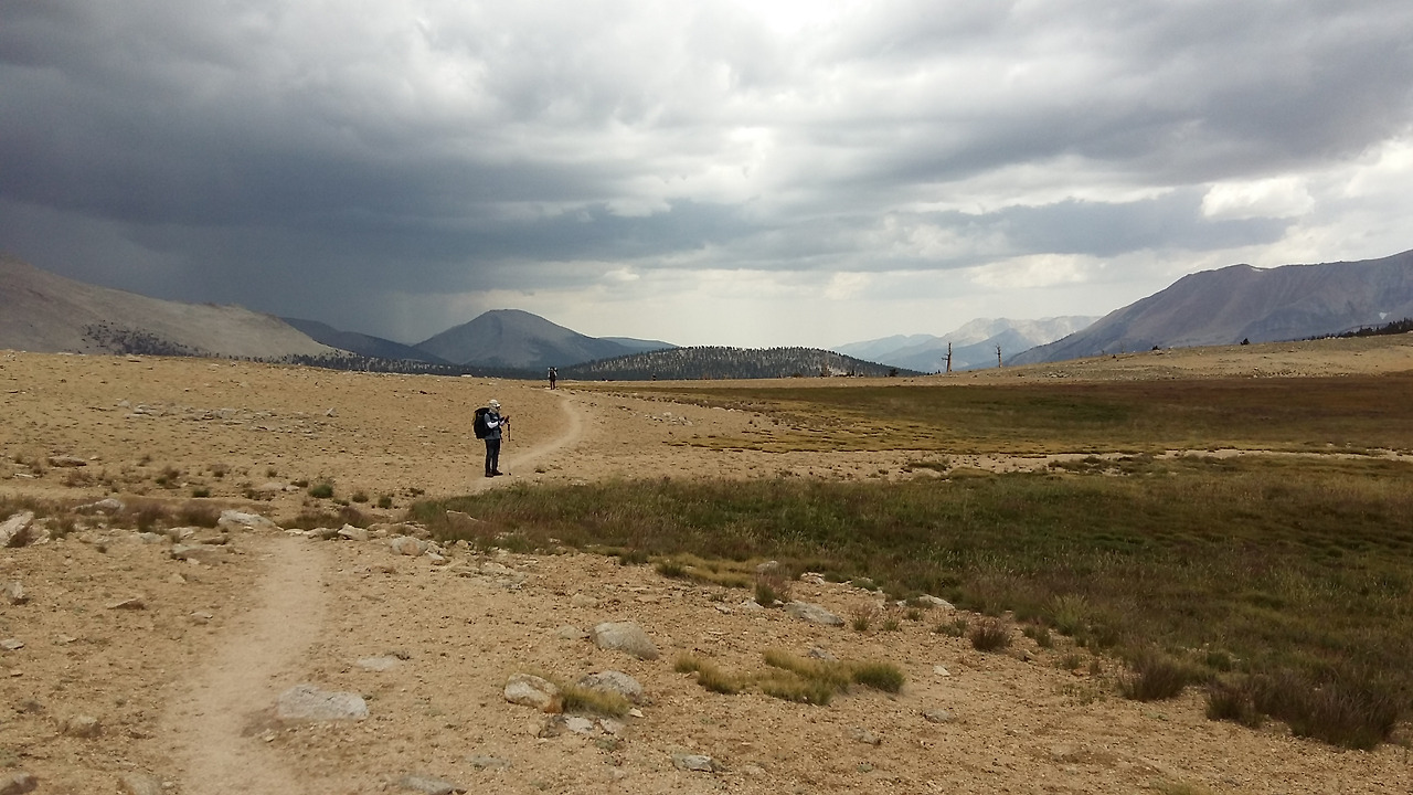 점심은 개울가에 묵직한 배낭을 내려놓고 행동식으로 미숫가루에 에너지바와 음료수로 포카리스웨이다. 체력소모가 큰 JMT에서 이것으로는 부족해 배고픔은 느낀다. 욕심을 부려 많이 가지고 올 수는 있겠지만 매고 갈 배낭 무게가 무거워진다. 가볍게 지고 가고 싶은 마음과 많이 잘 먹고 싶은 마음의 최소 공약수를 찾는 게 JMT에서 중요한 결정이 된다. 나름으로 준비해 온 오곡 선식으로 중간중간 보충해 마셨다. 먼길에서는 먹는 것도 쉽게 나누어 먹을 수 없는 야박함이 있다. 내가 살아남아야 남에 짐이 되지 않고 남을 도울 수 있는 여력이 생긴다. 정오를 지나면서 하늘이 점점 어두워져 오고 구름이 끼는 게 심상치 않다 했더니 비를 뿌린다. 휘트니 쪽으로는 천둥 번개와 함께 검은 구름이 잔뜩 끼여 있다. 우의를 입고 걷다 보면 더워서 입었다 벗었다를 반복하며 걸었다.