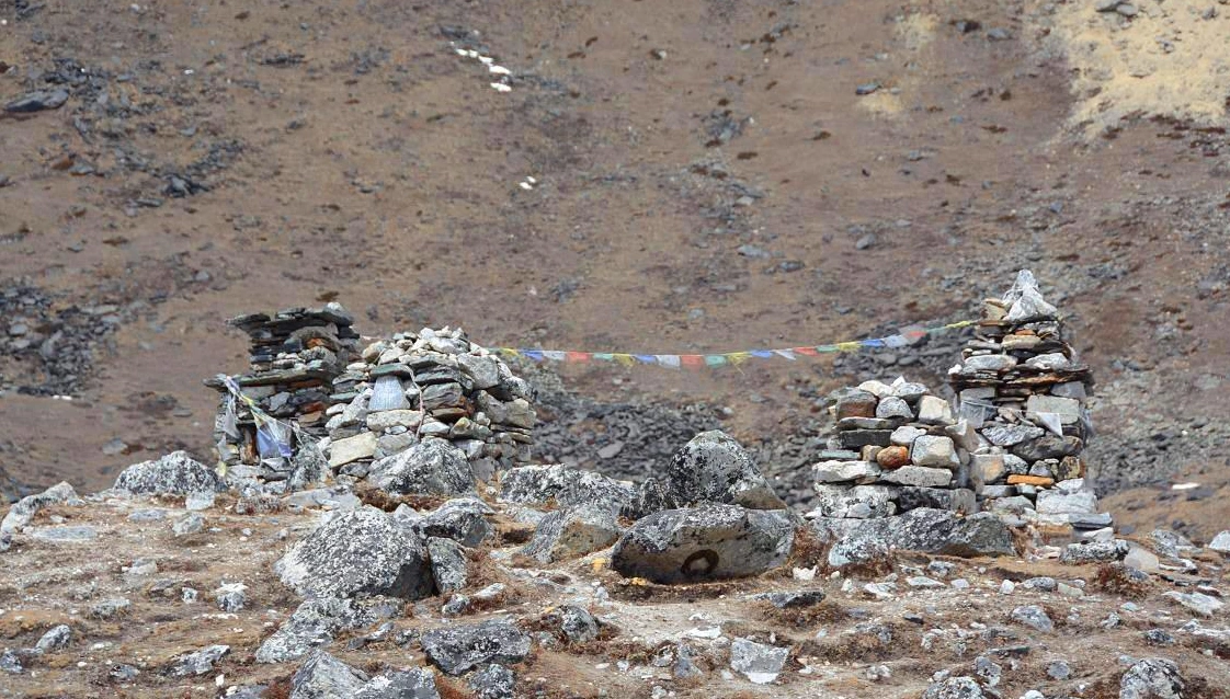 고도를 높인 탓에 이제 바람도 강하고 차갑게 느껴져 춥다는 말이 저럴 나온다. 유럽에서 온 다큐멘터리 팀이 이곳에서 취재를 하고 촬영도 한다. 히말라야의 고산에 대한 도전을 하다가 영원히 히말라야에 그 꿈을 묻은 영혼들에게 명복을 빌고 길을 떠났다. 곧이어 촐라패스에서 넘어온 분들과 만나는 길. 완만한 눈 쌓인 길이 이어지는데 쿰부 빙하에서 흘러내린 황량한 빙하 퇴적 지대를 통과하게 된다.