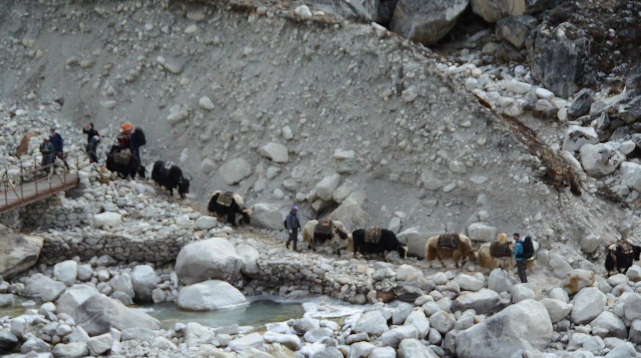 어제 추쿵에서 임자체 베이스캠프를 힘들게 다녀왔더니 피곤하여 아랫입술이 부풀었다. 입술연고를 발랐는데 몸은 전체적으로 묵직하다. 고산에서는 무리한 행동은 금물이다. 투클라 가기 전 작은 개울을 건널 때는 지난 우기 때 다리가 떠내려 가고 새로 설치한 다리를 건넜다. 우기인 여름철에는 비가 많이 오는 에베레스트 계곡이다. 로부체로 올라가는 짐을 잔뜩 실은 야크 떼가 줄지어 오르고 다시 짐을 싣으러 가기 위해 내려오기도 한다. 그런 순환의 삶이다. 투클라에는 잠을 잘 수 있는 롯지는 없고 식사만 할 수 있는 레스토랑이 있는 곳이다. 시간이 너무 일러 식사는 하지 않고 따뜻한 차만 한잔하고 올랐다. 추울 때는 따뜻한 차 한잔이 몸과 마음을 데워준다. 몸이 편하면 마음도 따뜻해진다.