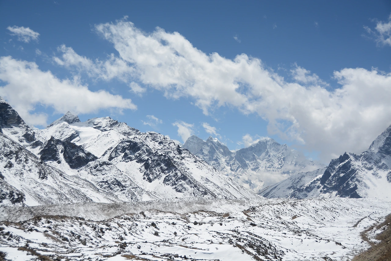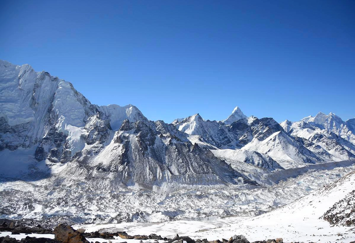 바람이 거세게 불긴 했지만 추위를 생각해서 겨울 복장을 단단히 챙겨 입고 올라왔기에 견딜만하다. 바윗돌에 앉아 내려 다 본다. 쿰부 빙하 건너편에서 눈이 와르르 무너져 내리며 굉음을 낸다. 연신 무너져 내리는 설산을 보니 무서움이 느껴진다. 산은 늘 인자하고 자애로운 얼굴은 아니다.