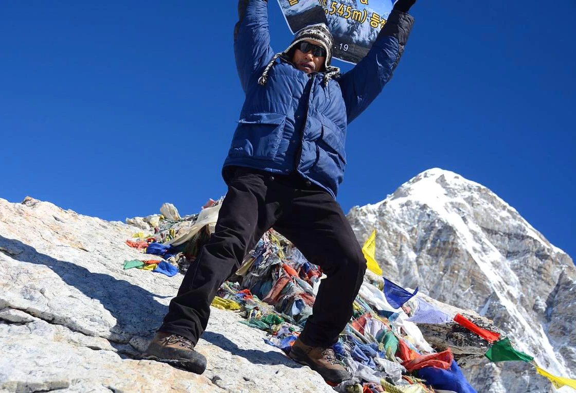 오르면서 많은 생각을 했다. 이제 이보다 더 높은 곳을 오를 날이 올까? 어쩌면 마지막 최고봉은 되지 않을까? 높이 오르려면 천천히 올라야 한다. 정상에는 쵸르텐과 무수히 펄럭이는 타르쵸가 강한 바람에 펄럭인다. 뒤로는 푸모리(7,165m)가 있고 옆으로는 링트렌(8,749m) 그리고 연이어 쿰부체, 눕체, 세계 최고봉 에베레스트는 워낙 높아 눈은 쌓여 있지 않고 눈보라로 인해 설연이 피어오르고 있었다.