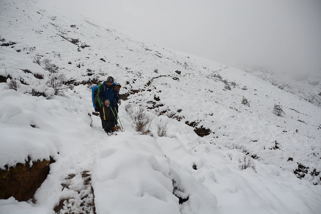 이 정도의 눈은 국내에서도 경험하였고 럿셀을 하면서 산행을 한 적이 있어 그리 걱정을 하지 않고 눈을 즐겨 보려고 포터들에게 계획대로 하산을 한다고 했다. 아침식사를 하고 배낭을 챙겨 매고 습설이라 배낭 위로 우의를 입고 출발했다. 그런데 같이 로지에 머물고 있는 유럽인들은 하늘을 쳐다보면서 갈지 말지를 여전히 고민하고 있다.