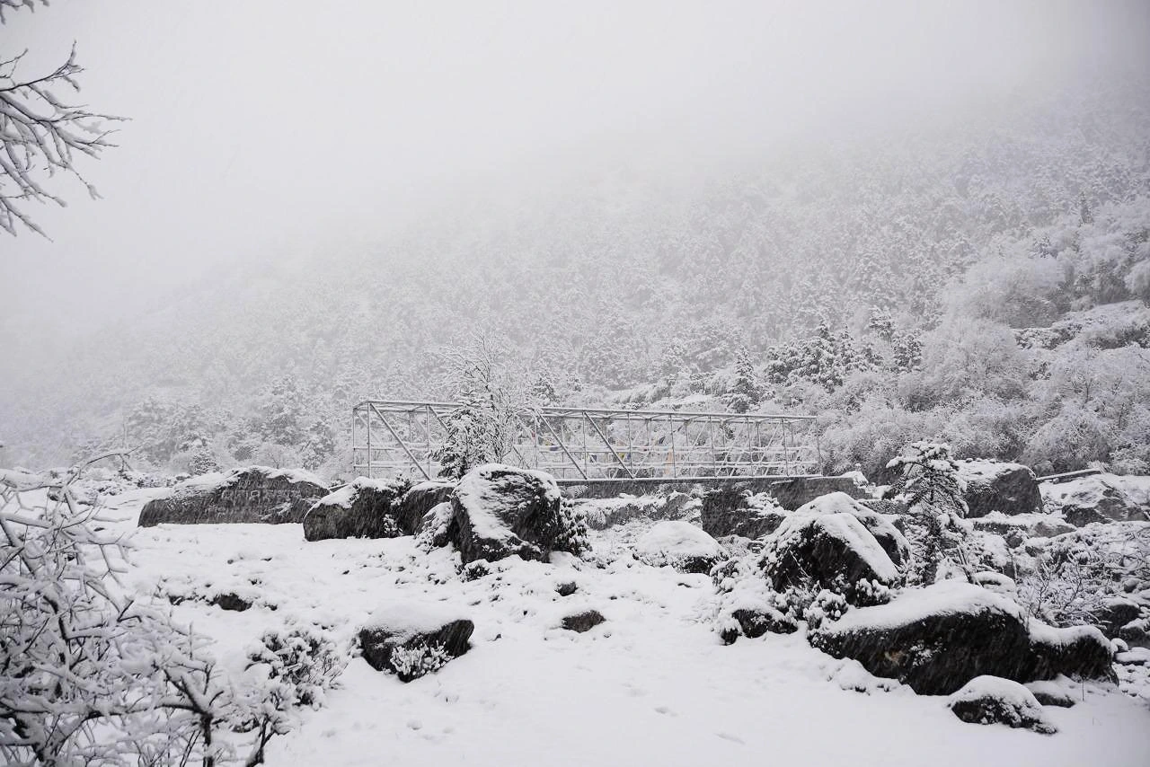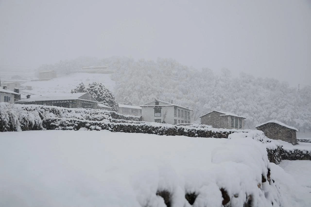 히말라야에서 식전에 늘 하는 버릇이 생겼다. 식사 전에 숙소 주변 아침산책이다. 오늘도 산책을 하려고 나오니 온 세상이 은빛세상으로 바뀌었다. 히말은 산스크리트어로 눈(雪)이란 뜻인데 지금까지 제대로 눈 내리는 모습을 보질 못했다. 트레킹 후반에 히말라야의 축복이 있어 원 없이 눈을 만지며 눈길을 걸을 수 있었다. 눈은 온 세상을 은백색으로 바꿀 만큼 많이 내렸고 계속 내리고 있었다. 분위가 너무 좋아 강 건너 마을인 포르체 마을을 다녀오기로 하고 길을 나섰다.