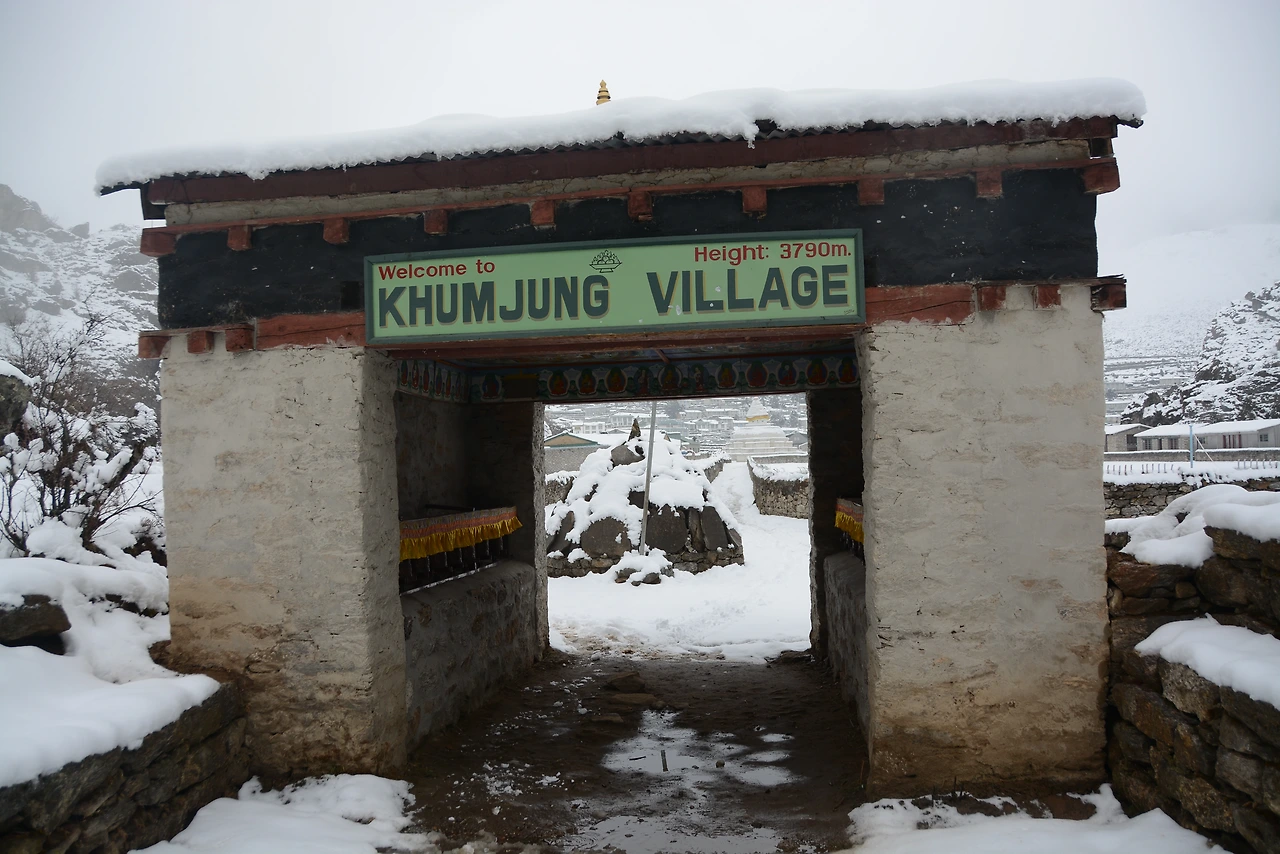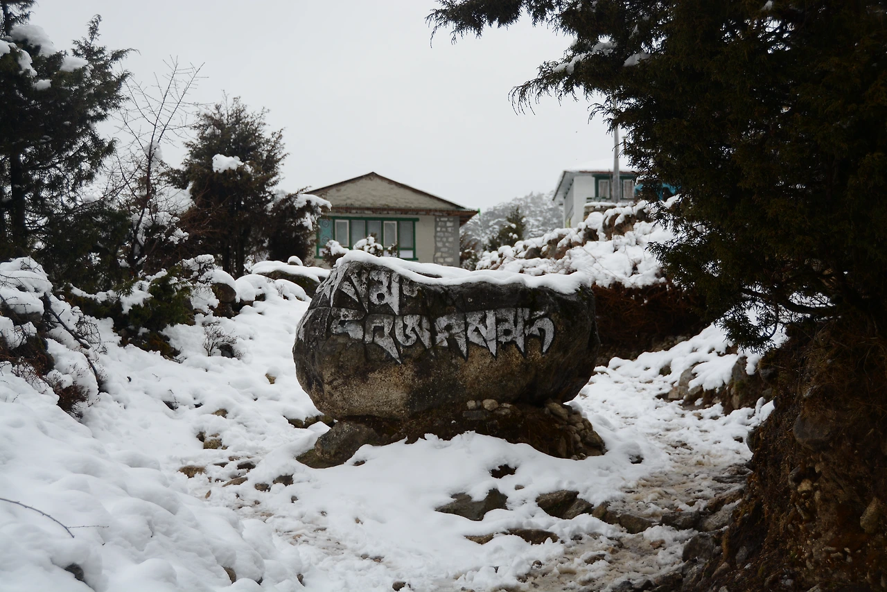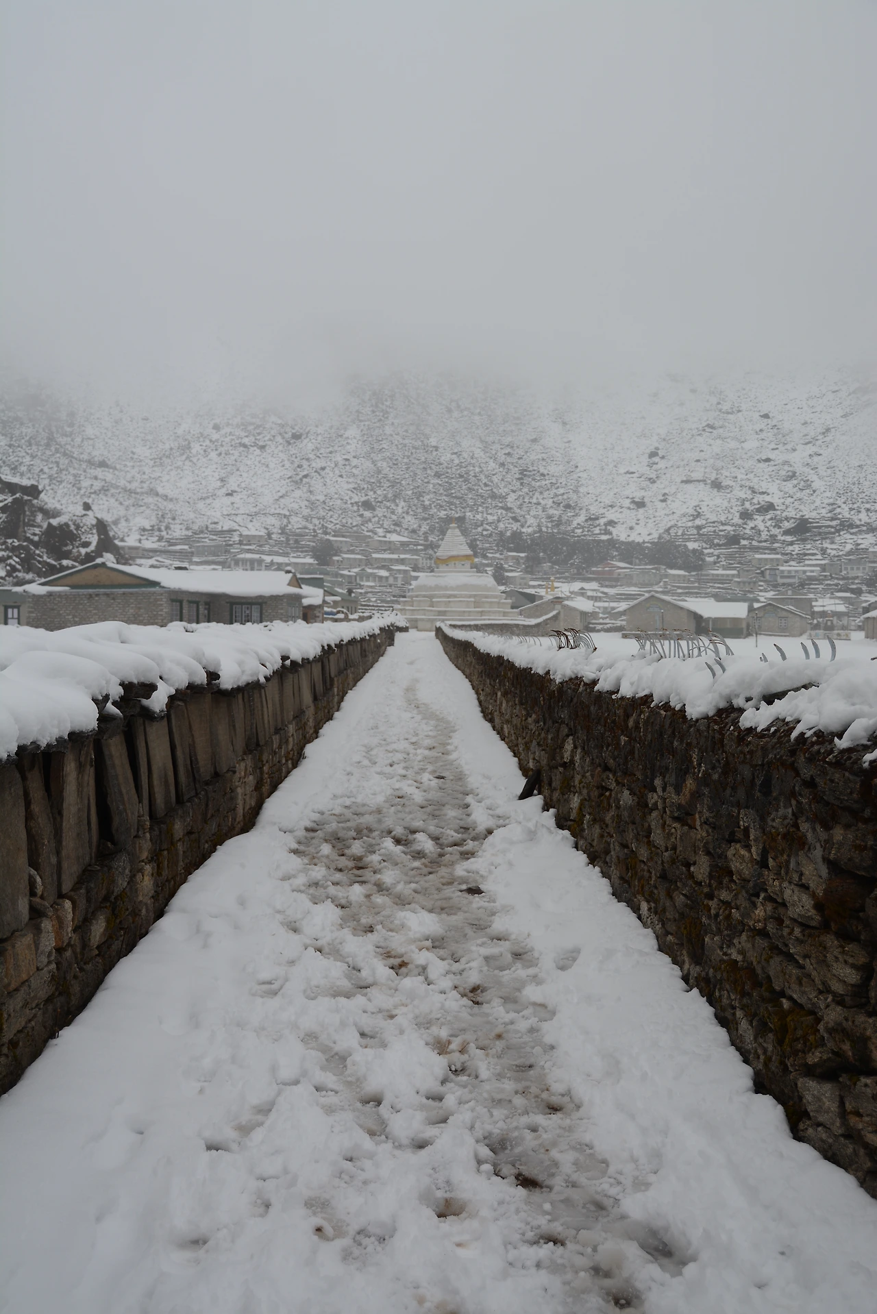 규중은 남체만큼은 크지 않지만 상당히 큰 마을로 남체로 온 트레커들이 고산으로 올라가지 못하고 남체 만 둘러보고 내려가는 나이 지긋한 트레커들이 반드시 찾는 곳이기도 하다. 내리던 눈이 안개비로 바뀌어 내리는데 안개가 짙어 시야가 멀지 않은 게 아쉬움이다. 그간 내린 눈만 보았지 눈을 맞아 보진 못했는데 처음으로 실컷 눈을 맞으면서 눈 속을 걸어 남체로 내려서는데 남체를 한눈에 볼 수 있는 곳에서 사진을 찍어 보면 마치 로마 원형경기장을 많이 닮았다는 생각을 하였다.