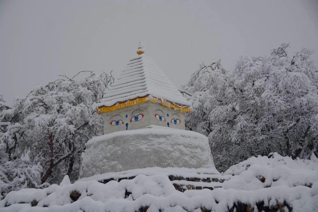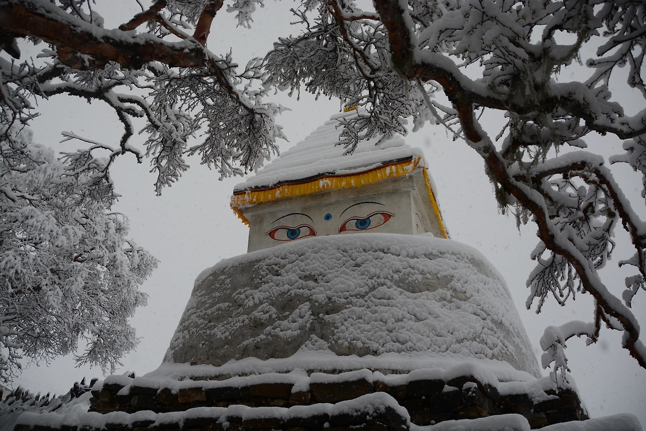 마을 어귀는 어김없이 불탑 타르쵸가 자리리 하고 있고 오색 초르텐이 쳐져 있다. 그 위로 눈이 소담스럽게 쌓여 있다. 꽤 큰 마을인데 인적이 뜸한 걸 보면 눈이 내려 특별히 할 일이 없는 듯하다. 눈이 내리고 있어 더욱 고즈넉한 포르체 마을의 돌담길을 따라 옛 시골 고향길을 걷듯 마을을 한 바퀴 돌았다. 참 아담한 마을이다. 눈이 내리니 인적조차 없다. 히말라야 산속 마을의 풍경이 포근하다. 두르코시강의 다리를 건너 롯지로 돌아올 때까지 눈이 펑펑 내린다.