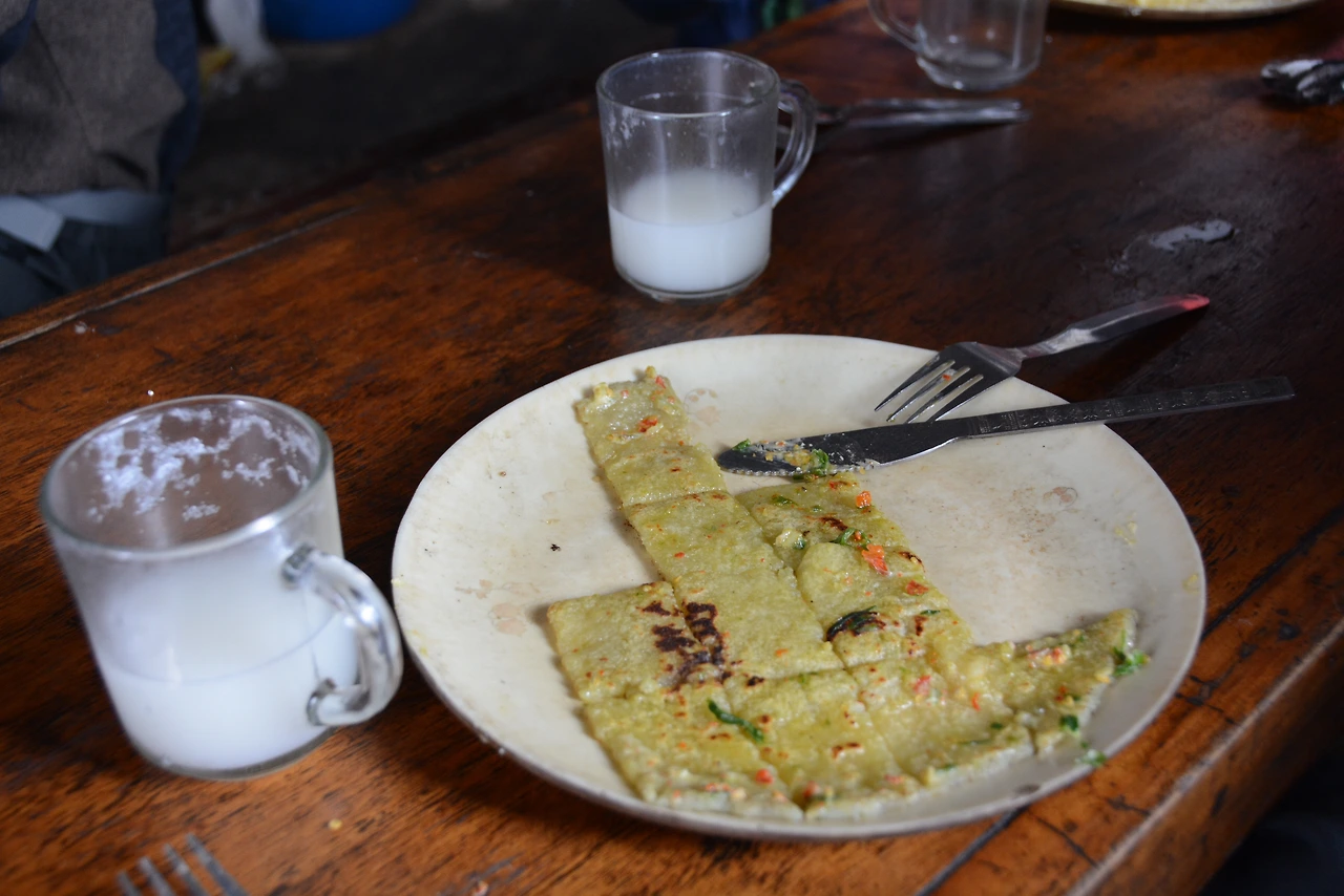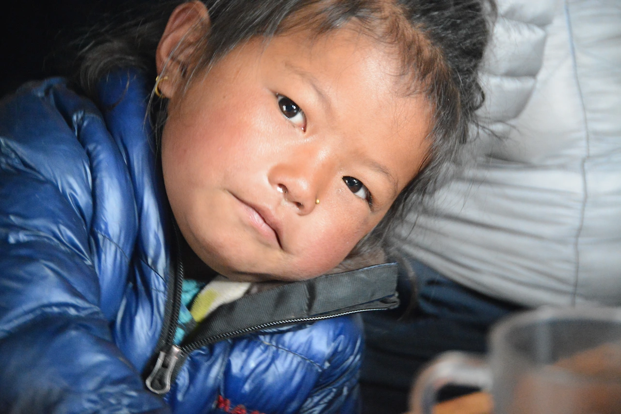 그간 고소를 염려하여 술은 자제하였는데 이제 몽까지 내려왔으니 한잔 마셔도 될 고도이고 체력 상태도 좋다. 역시 알코올기가 온몸으로 퍼지니 기분이 좋다. 포터들도 덩달아 창을 두 잔씩 마셨다. 작은 부엌에는 장작으로 불을 지피고 있고 감자 부침개로 주인집 꼬마 딸도 부침개로 식사를 한다. 아궁이 위에는 가지 말린 것 같은 게 있다. 검게 걸려 있는 게 뭐냐고 물으니 야크 고기로 연기로 훈제하여 필요할 때 물에 불려서 사용한단다. 이게 산골의 부족한 그들의 단백질 공급원이다.