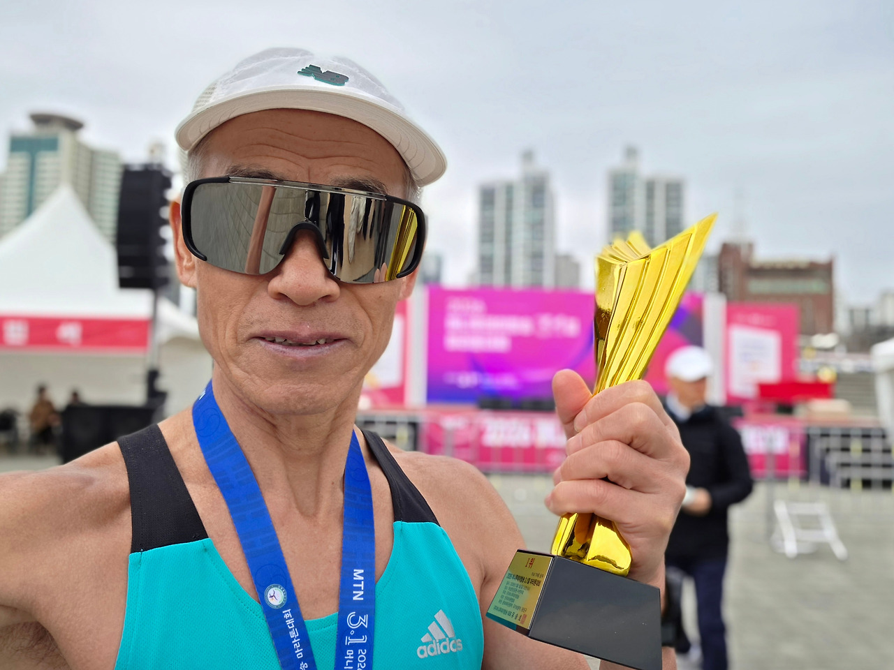 잠시 후 풀코스 1위는 기대했던 심진석 님이 아니고 다른 분이다. 심진석 님은 공사장 비계공으로 유명세를 타고 있는 분으로 전마협에 들어가 동계훈련으로 케냐 마라톤 유학을 다녀와 첫 출전이다. 내심 기대를 했는데 2위로 오고 있고 거리차가 꽤 있다. 나중에 확인하니 1회전 뛰고 DNF 했다.