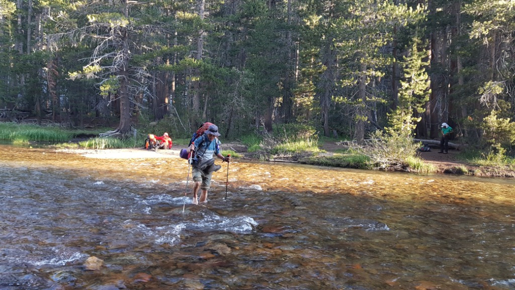 내리막길이라 걷기 좋은 세콰이어 숲길이다. 울창한 숲길을 걸어가다 보면 아스펜 메도우를 지난다. 초원은 계곡 옆에 널찍한 땅에 풀들이 자라서 녹색 숲을 만들어 놓았다. 계곡 폭이 10m도 훨씬 넘는 넓은 계곡을 건너야 하는데 다리가 없다. 여기는 등산화를 벗고 건너야 하는 곳이다. 양발까지 벗고 바지는 무릎까지 둥동 걷고 등산화는 신발끈을 묶은 다음 목에 걸치고 스틱을 짚고 조심스럽게 계곡을 건넜다. 다행히 수심이 깊지 않고 물살도 세지 않아 건너기는 그리 어렵지 않았다.