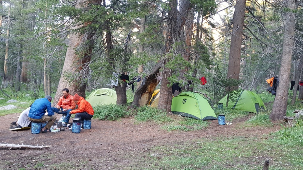 새벽 기온이 쌀쌀한 게 일교차가 극심하게 느껴지는 JMT다. 덜덜 떨면서 4시에 일어나 피곤한 몸뚱이를 끌고 나와 출발 준비를 한다. 야영지가 계곡 옆 물가 바위 옆이라 물소리가 요란하다. 어둠 속에서 랜턴 불을 켜서 짐 정리를 끝냈는데도 어둠이 걷히지 않는다. 어제 맨 늦게 도착한 여성분이 얼마나 피곤했는지 출발시간이 되어도 일어날 기색이 없다. 다들 피곤이 누적되니 사소한 말에도 신경이 예민해져 까칠한 상태라 건드리면 폭발할 것 같아 누구 하나 깨우질 못한다.