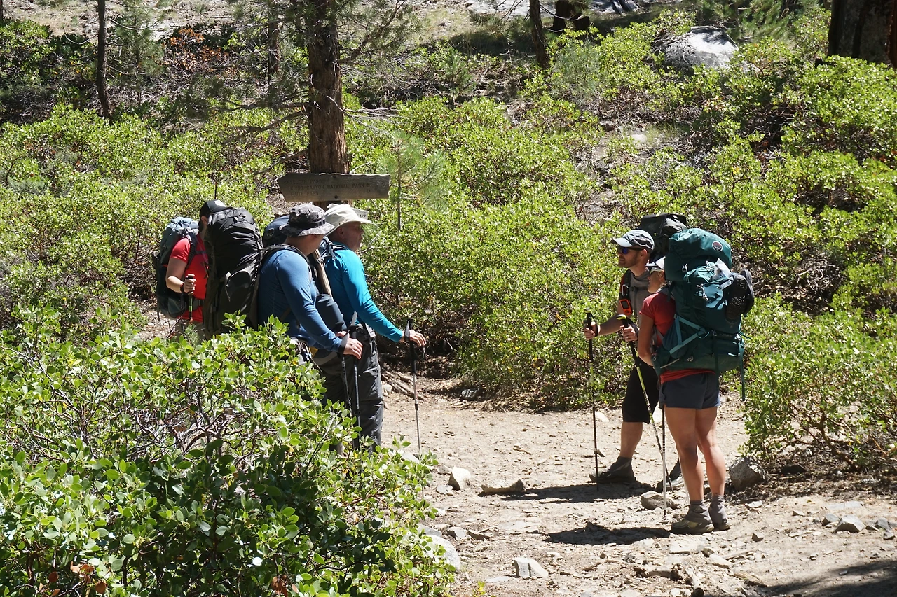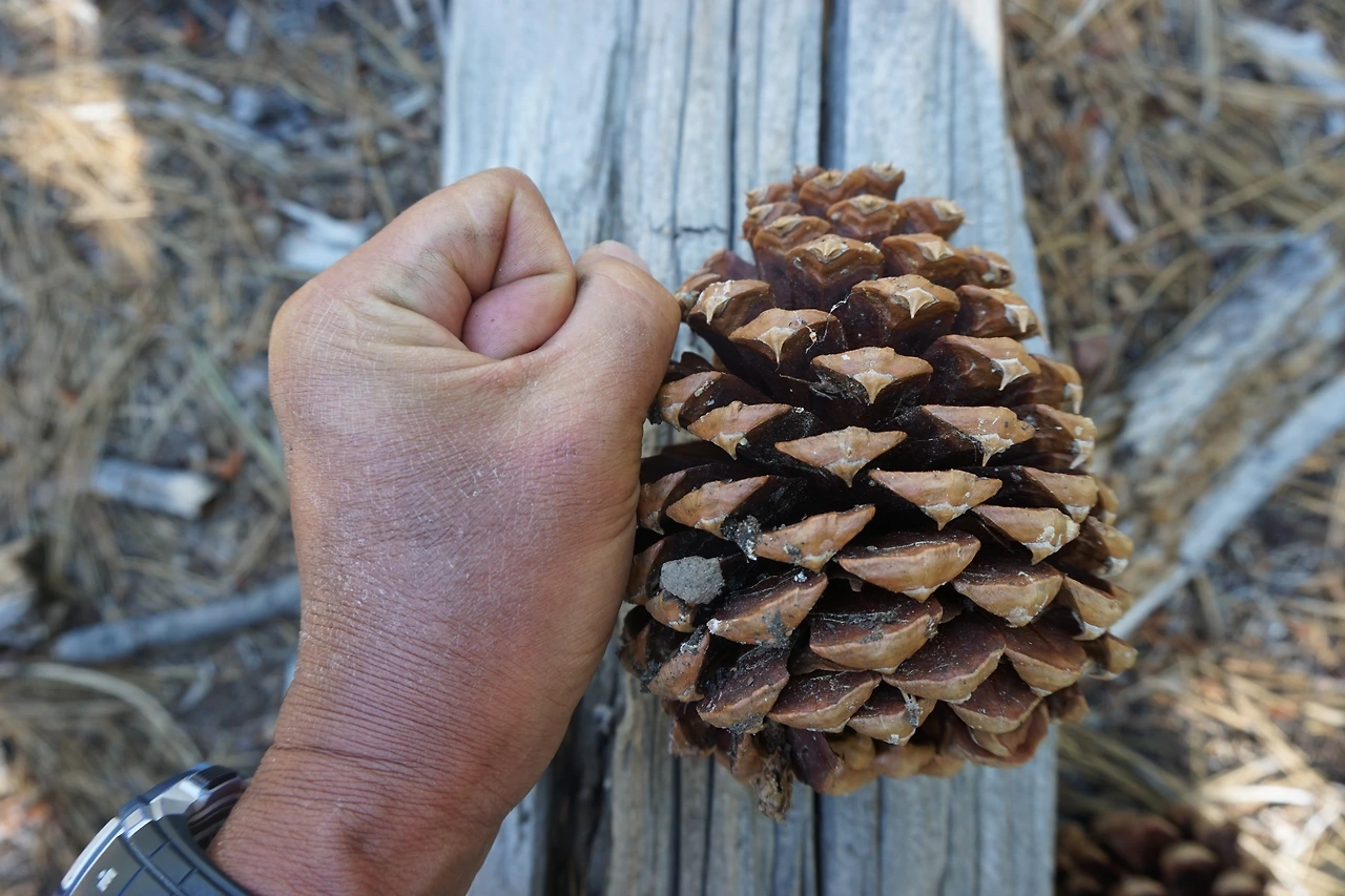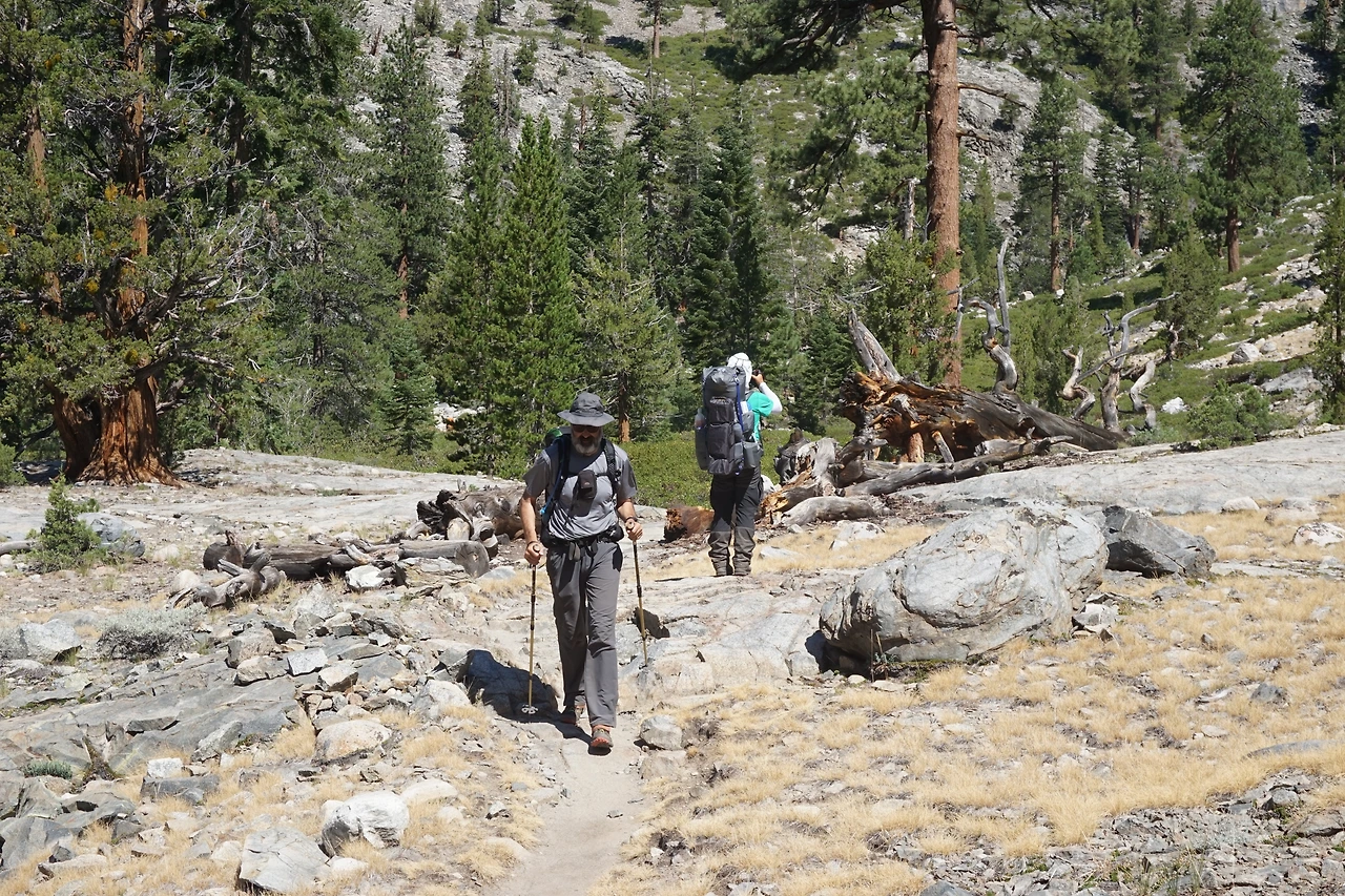 숲길에는 세콰이어 나무뿐만 아니라 미국산 소나무가 자라고 있다. 미국 소나무의 솔방울이 어른 주먹보다 훨씬 큰 솔방울이 가득하니 떨어져 있다. 그 옆으로 향나무는 세월의 연륜을 말해 주듯 밑둥이가 어른 두 명이 감싸 않아도 감싸지 못할 만큼 크다. 계곡과 만나는 삼거리 길에서 뮤어 렌치에 10일 치 식량을 보급받고 남진하는 트레일러를 만났다. 식량이 줄어들 동안 식량이 가득한 무거운 배낭을 메고 다녀야 한다.