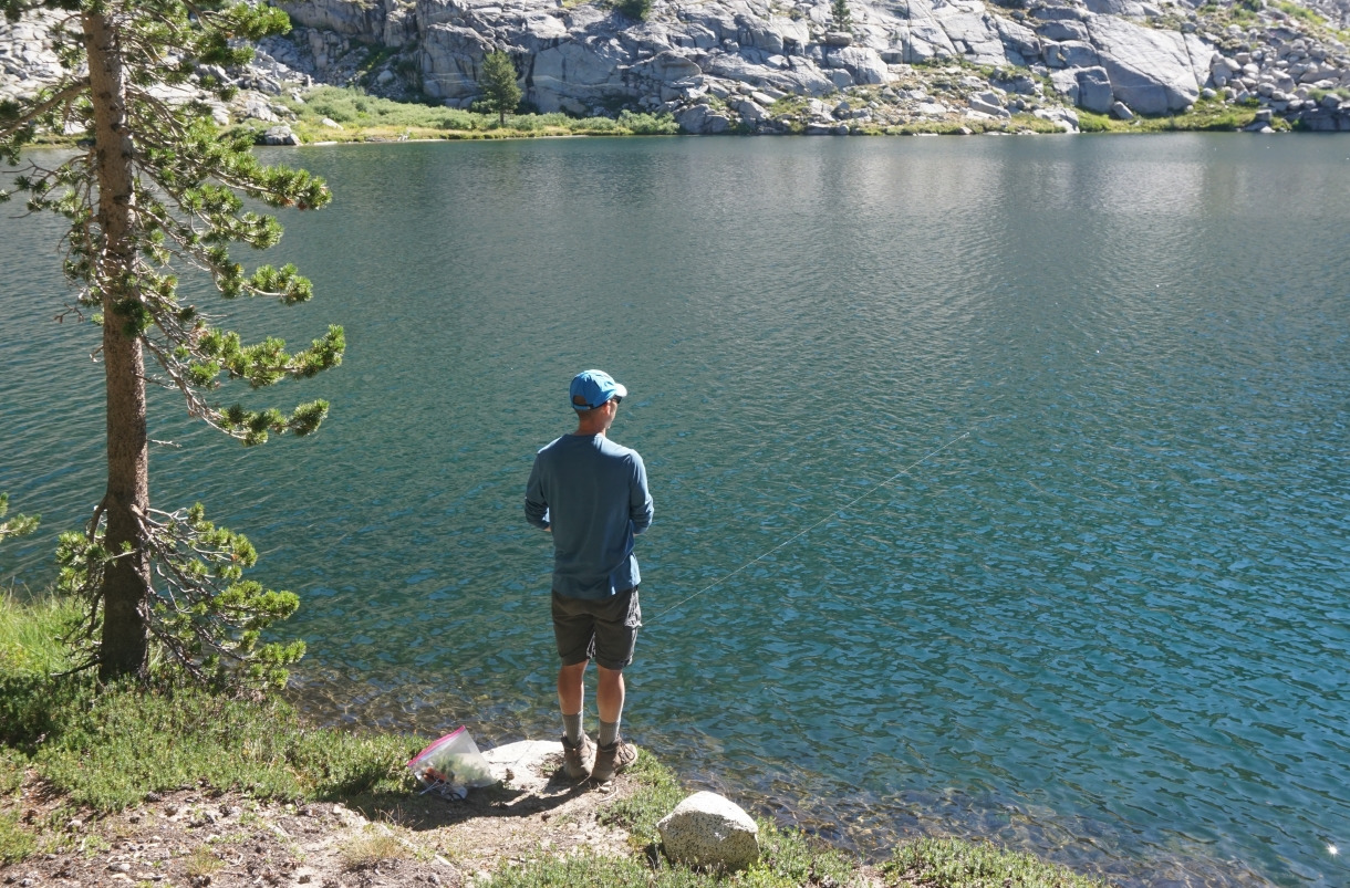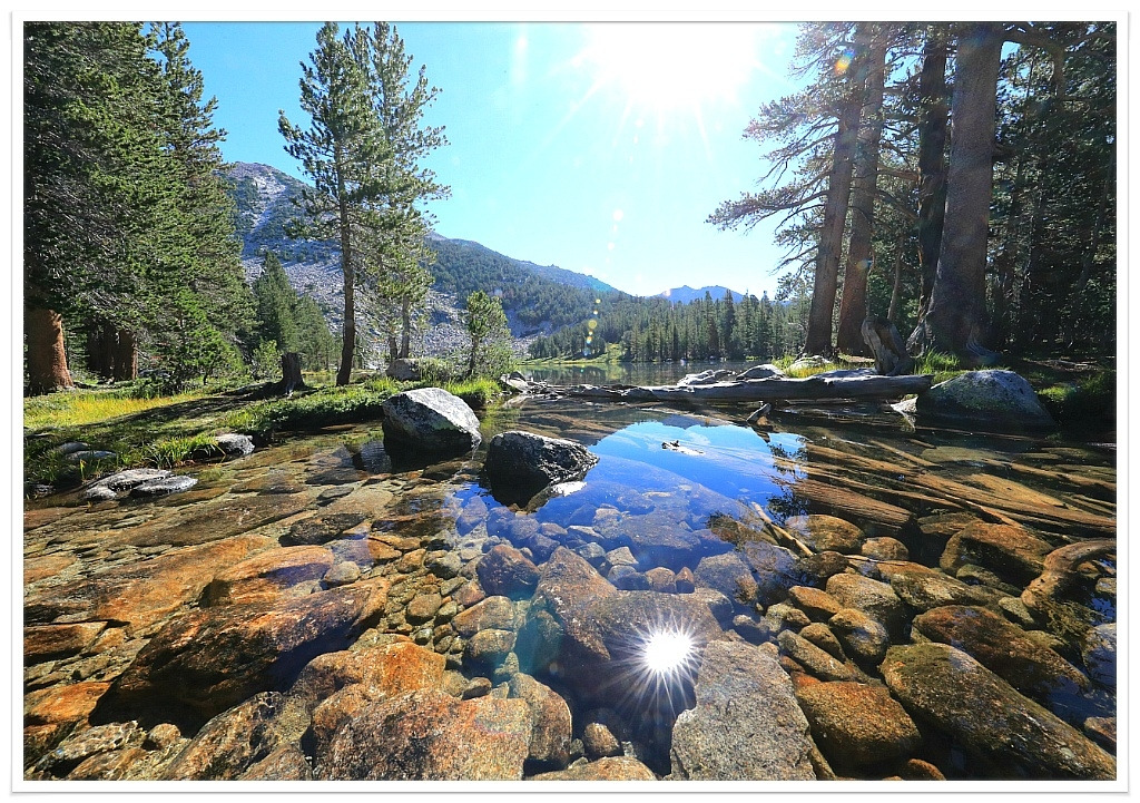 오름이 끝나니 세콰이어와 소나무로 된 숲길이 걷기가 좋다. 연이어 초원으로 이어지고 Jmt 옆길에는 개울이 흐른다. 셀리 키스 호수에서 잠시 쉬어 간다. 바닥이 훤히 보이는 호수에는 송어가 한가히 헤엄쳐 다니고 호수에는 세콰이어와 주변 산들이 그대로 반영된다. 트레커가 아침에 잠시 시간을 내어 송어 낚시를 하고 있다. 낚시 허가를 받아 와야 낚시를 할 수 있다. 이런 모습은 Jmt에서만 볼 수 있는 풍경이다. 호수는 그 옆의 호수와 연결이 되어 2개의 호수로 아침햇살을 받아 보석 같이 빛난다. 두 호수는 마치 쌍둥이 호수 같이 존 뮤어 트레일을 가운데 두고 둘로 나뉘어 있다.