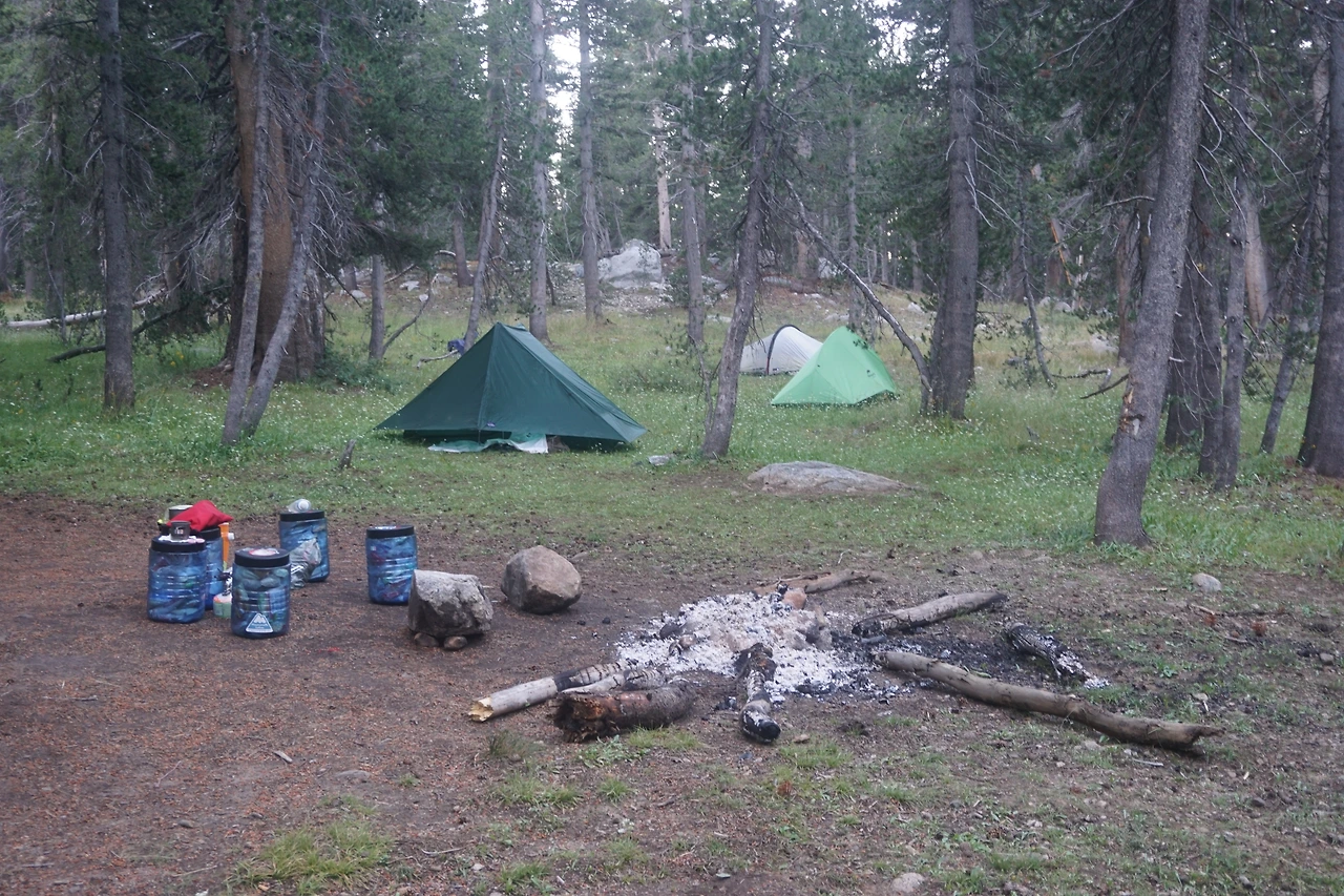 하룻밤을 지새운 캠핑 그라운드와 모닥불의 흔적, 곰 통은 의자 대용