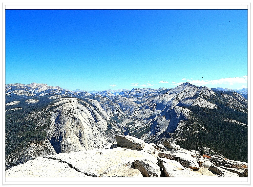 한낮으로 가는 시간에 오름길은 힘이 들어 땀이 삐질삐질 난다. 하프돔 전위봉 아래에다 배낭을 내려놓고 가볍게 전위봉을 오르는데 입구에는 인턴 레인저가 입구를 지키고 퍼밋 검사를 하고 있다. JMT퍼밋이 있으면 별도 퍼밋이 없어도 하프돔을 오를 수 있다. 전위봉을 오르는 길은 가파른 바위산을 오르는데 돌계단을 오르고 경사진 바위 사면을 오르는 길이다. 높이를 더 할수록 요세미티 계곡이 한눈에 들어온다. 거대한 바위로 이루어진 골짝골짝마다 경치가 장관이다. 절로 카메라 셔터를 누르게 된다.