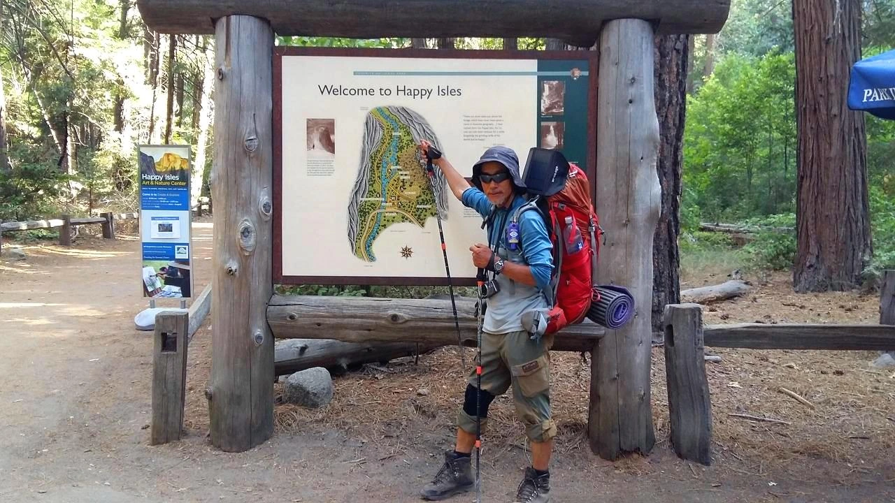 칩멍크가 넘나드는 길을 따라 내려오면 급수대를 지나 다리를 건너면 오랜만에 밟아 보는 시멘트길이 이제 존 뮤어 트레일이 끝남을 알려준다. 계곡에는 더위를 식히는 비키니 차림의 여인네들이 많은 것 보니 피서철임을 실감한다. 다리를 건너기 전에 안내표시가 해피 아일 표시가 있다. 요세미티를 순회하는 셔틀버스가 지나가는 방향에 존 뮤어 트레일의 남진하는 분에게는 시작점이자 북진하는 분에게는 종점인 해피 아일(Happy Isles)에 도착하여 대장정의 막을 내린다.