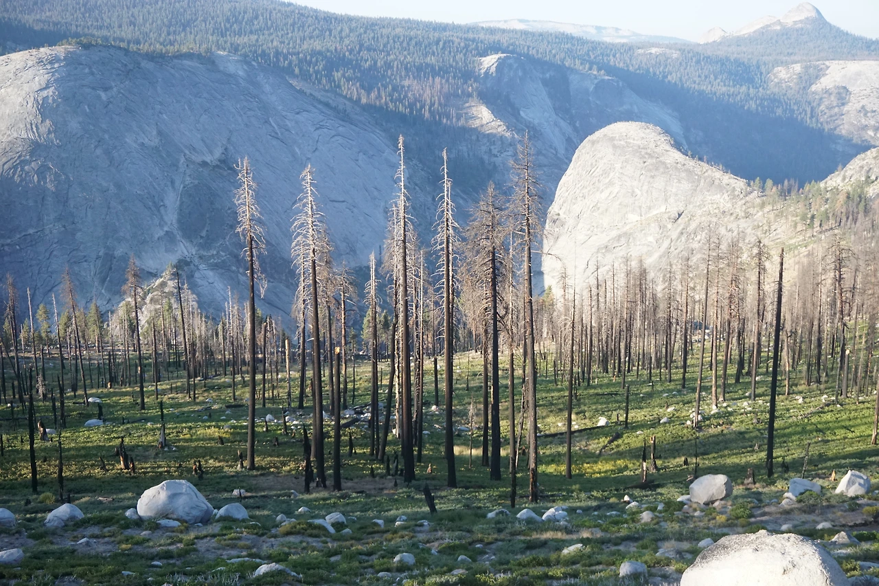 오름길을 거의 없고 내리막길이라 편안한 길이다. 몇 년 전에 이곳에도 화마가 휩쓸고 간 흔적이 아직도 남아 새까맣게 탄 '나무들의 무덤'을 지나간다. 이곳의 기후는 고온 건조한 곳이라 자연발화인 낙뢰로 인한 산불도 자주 발생되는 지역이다. 종종 뉴스로 전해 들은 산불 소식이 이곳 주변의 산불이다. 나무들의 공동 무덤을 지나듯 검게 탄 나무들을 베지 않고 그냥 두고 있는 모습이 어찌 으스스하다. 그러나 이곳에도 희망의 씨앗을 볼 수 있었다. 파란 생명의 싹이 돋아나서 푸른색으로 채색을 하고 있었다.