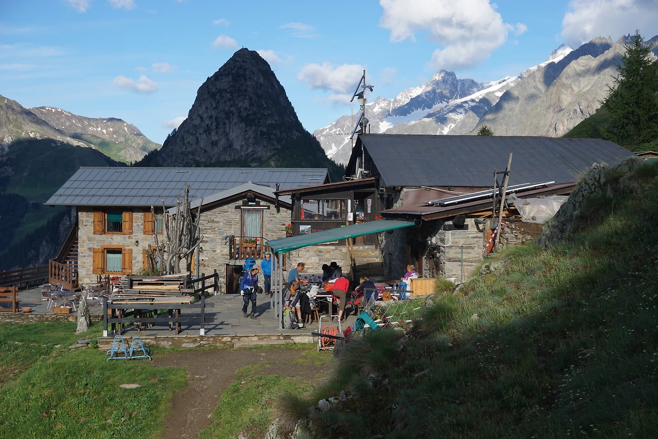 여기서 베르토네 산장으로 가는 길을 고행의 길로 숲길을 걷다가 점점 가파른 된비알을 2시간 넘게 걸어 올라야 하는 힘든 길이다. 힘든 만큼 이곳에서 내려다보는 쿠르마이에유 마을 풍경을 한눈에 내려다볼 수 있다. 베르토네 산장에 도착해 갈증을 풀려고 마시는 생맥주가 가슴까지 시원함을 전해준다. 주변에 탠트를 칠 수 있느냐고 하니 여기는 2,000m이고 2,500m부터는 탠트 설치를 해도 된다고 한다. 산장 위로 올라 전망 좋은 나무 아래 탠트를 치고 이른 저녁으로 아껴둔 라면으로 저녁식사를 끝냈는데 나이 지긋한 어르신이 오더니 'No Tent'라고 하며 탠트를 철거하라고 한다.