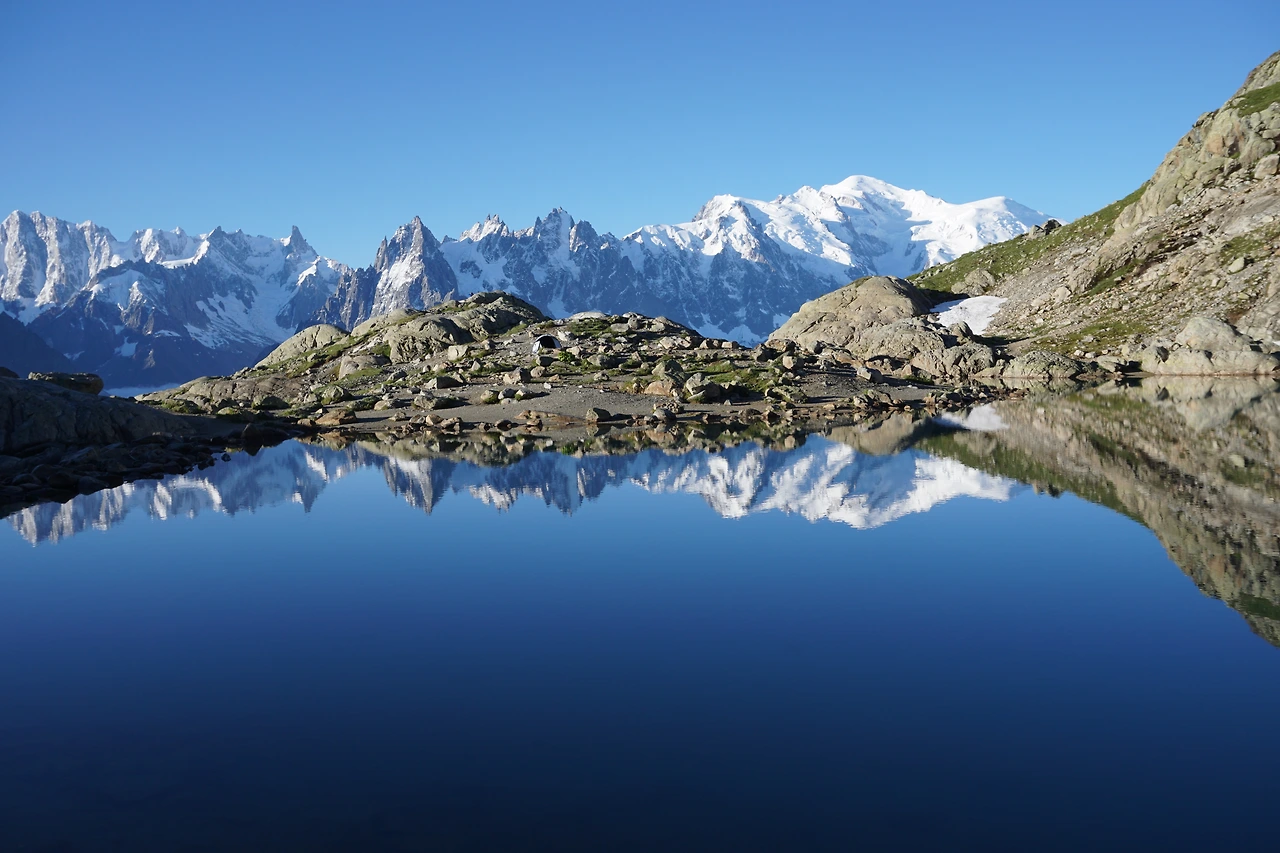 샤모니 마을은 안갯속에 쌓여 있고 온전히 몽블랑을 마주하며 일출을 볼 수 있는 행운이다. 락 블랑의 자랑은 2,000m가 넘은 산정에 블랑 호수가 있다는 것이다. 그 호수에 반영된 몽블랑 산군은 최고의 그림이 된다. 특히 바람이 불지 않는 이른 아침은 바람이 잠잠해 블랑 호수 수면은 거울 같이 비친다. 이때가 사진을 찍는 최고의 시간으로 호수에 비친 몽블랑 산군을 제대로 담을 수 있다.
