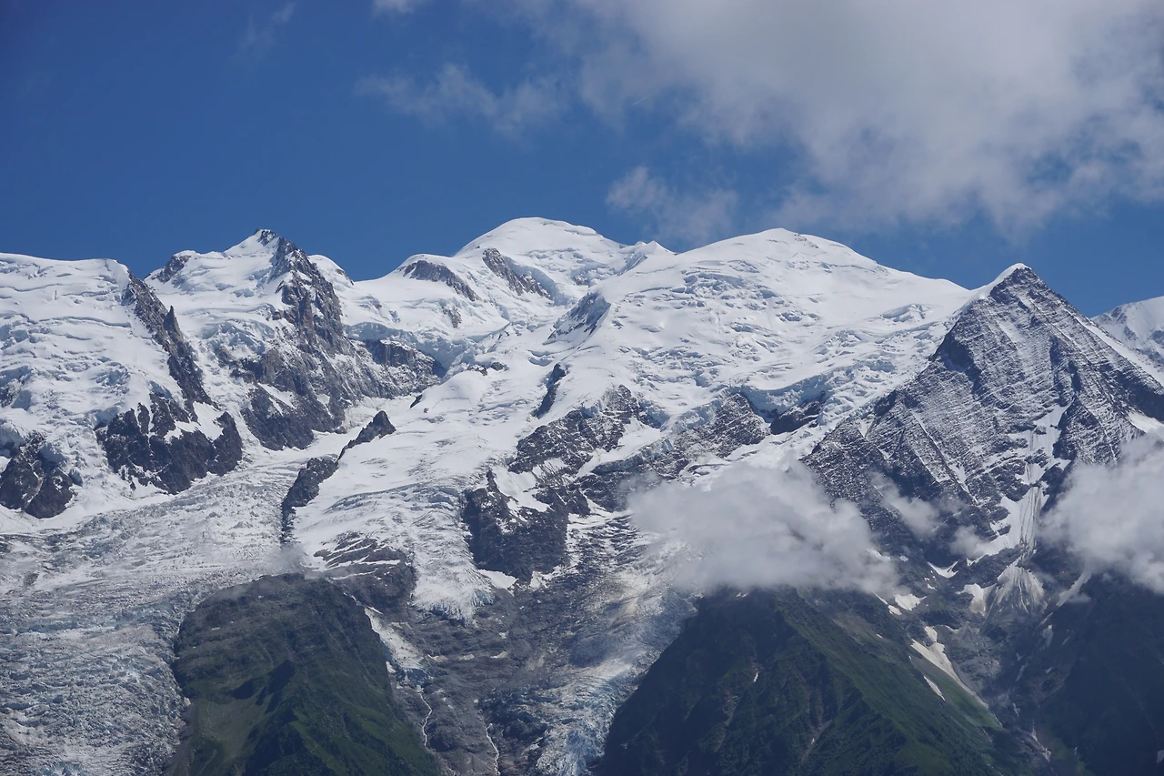 그렇게도 생얼을 보여 주지 않던 몽블랑의 민낯을 마주 볼 수 있는 아침이다. 몽블랑(Mount Blanc)은 불어로 '하얀 산'이란 뜻이고 이탈리아어로는 '몬테비얀코'라 한다. 4계절 늘 흰 눈이 쌓여 있는 산이다 보니 이런 이름이 붙여졌다. 몽블랑은 빙하와 화강암으로 이루진 산으로 높이는 4,807m로 1786년에 발마와 파카르가 처음으로 등정에 성공한 산이다.