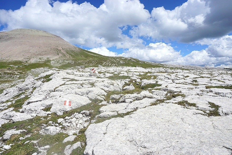 점심식사는 하였고 여기서 맥주 한잔은 피로를 풀어준다. 1번 길을 따라 몬티젤라로 향했다. 몬티젤라는 마치 달나라에 온 듯 백운석이 넓게 깔린 바위 평원으로 좀체 접하기 어려운 풍경으로 빨강과 흰색으로 칠한 길을 따라 이어지는데 이곳의 최고 높이는 2,660m로 멀리 내일 걸을 크로이츠 코펠 산군이 병풍처럼 둘러싸고 있고 그 아래로 라 벨라 마을이 자리 잡고 있다.