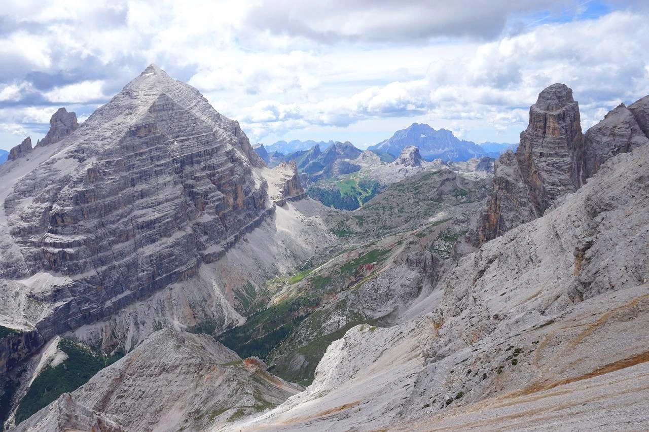 여기서부터는 다시 바위 능선길을 걷는데 길 양 옆으로는 수천 길의 낭떠러지다. 전망하나는 기가 차게 좋은데 그만큼 위험부담이 있는 길이다. 최고봉은 카발로로 2,912m로 3,000m에 조금 부족이다. 길은 이제 이 능선을 넘이 내려서는데 건너편엔 토파나 디 덴트로 산군이다. 그 산군은 협곡과 기묘한 바위가 생전에 처음 보는 멋진 백운석으로 이루어져 있다.