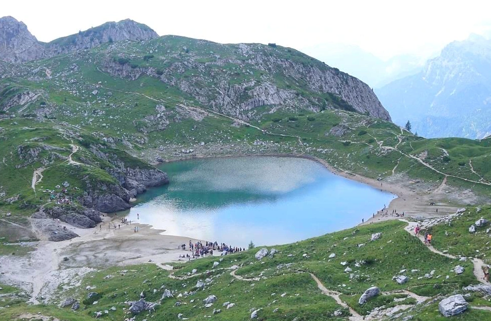 2,191m의 꼴다이 고개로 가는 길은 야생화가 지천으로 깔려 있고 고개를 넘으면 꼴다이 호수가 내려다 보인다. 2,000m가 넘는 곳에서 천상의 호수를 만나니 신기하다. 호수도 작은 게 아니라 무척 큰 호수인데 오늘 마침 이탈리아 청소년들의 행사가 있는지 호수 주변에 청소년들로 가득하다. 파란 하늘과 하얀 백운석 그리고 에메랄드빛 꼴다이 호수 거기에 녹색 초원이 펼쳐지는 꼴다이호수 주변 풍경은 천국이 따로 없고 여기가 천국이다.