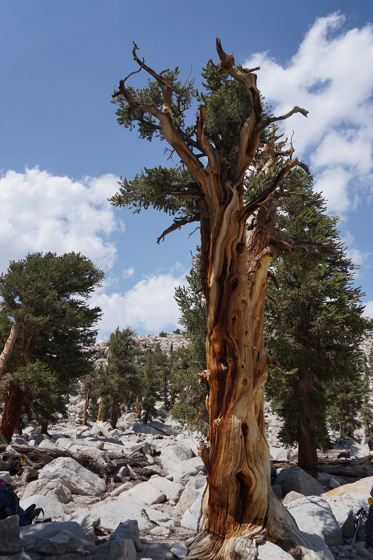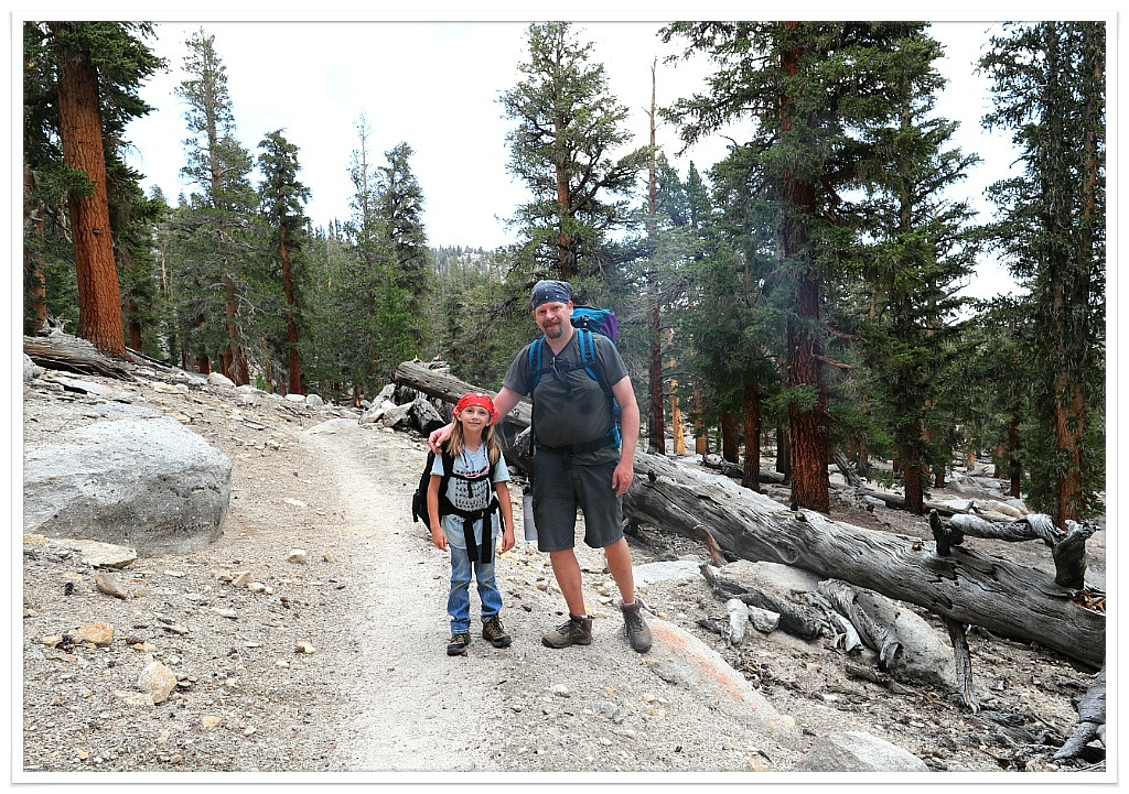 왼편 아래로는 넓은 초원이 펼쳐지는데 이곳이 빅 휘트니 메도우다. 오른편으로는 풀 한 포기 없는 바위산인데 듬성듬성 세콰이어 나무만 자라고 있고 산정상부는 생물이라고는 찾아볼 수 없는 돌산이다. 마사토가 깔린 트레일 길은 한낮으로 가면서 내려 쬐는 직사광선은 살인적으로 강렬하다. 잘 달구어진 모래와 바위에서 뿜어 나오는 후끈한 열기가 콧속까지 건조함이 느껴진다. 이럴 때는 자주 수분 공급을 해주어야 컨디션을 유지할 수 있다.