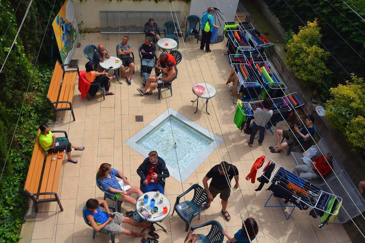 에브로 강을 건너서 있는 Peregrinos 알베르게 마당에서 휴식 중인 순례자들