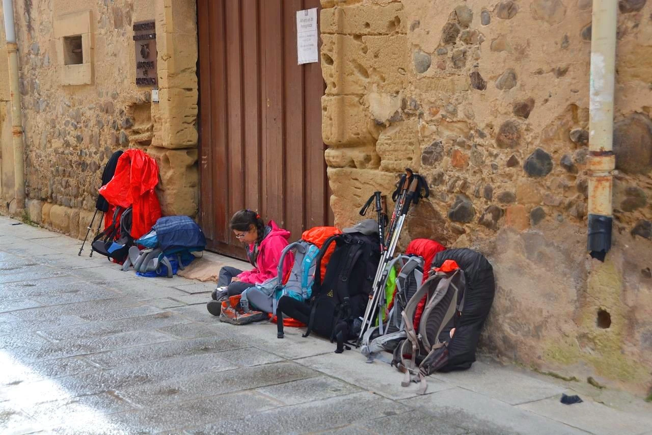 산토도밍고 공립 알베르게 앞에서 문이 열리길 기다리는 순례자 배낭과 순례자