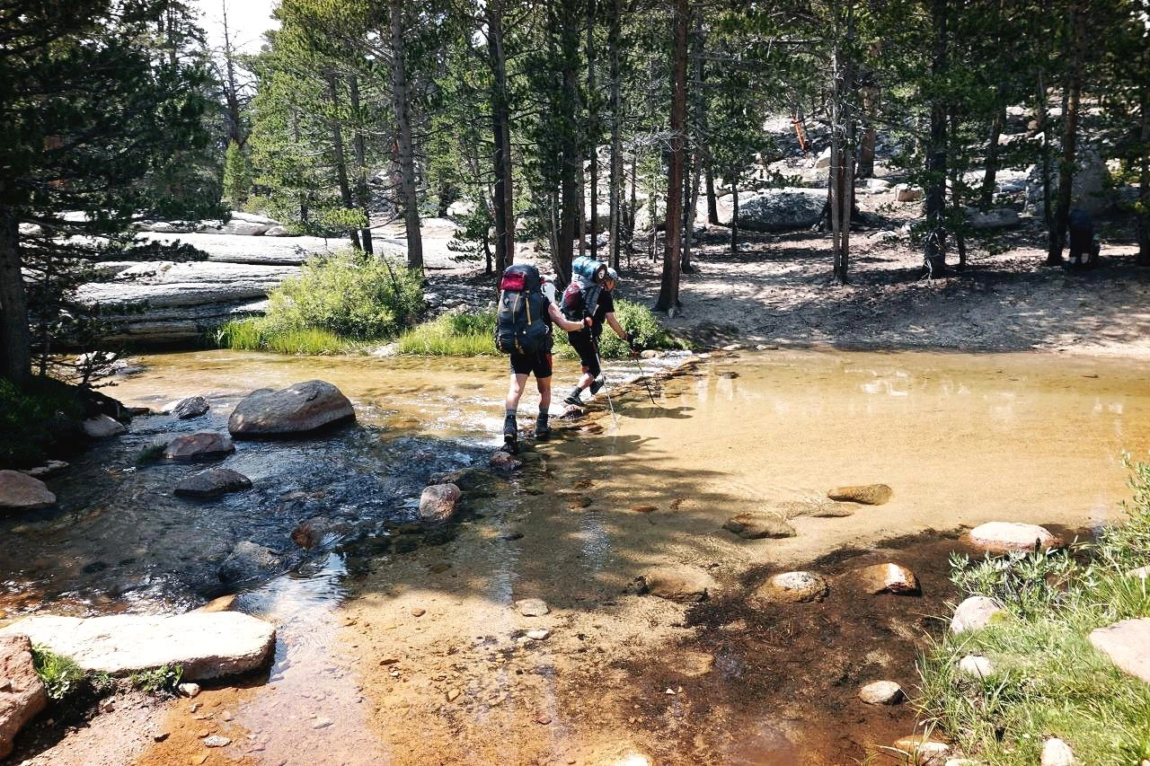 길이 끝나는 곳에는 7 ~ 8m쯤 되는 폭이 넓은 개울이 가로막고 있는데 건너는 다리가 없다. 존 뮤어 트레일은 길은 자연 그대로 보전을 목적으로 한다. 돌 징검다리가 있는데 물이 불어 잠겨 있다. 방수가 잘 되는 목이 긴 등산화를 신으면 잠깐 물에 적시는 정도라 건너도 되지만 트레일화를 신은 분은 신발을 벗고 건너야 한다. 자연적인 통나무나 돌을 딛고 건넌다. 그만큼 인공이 없는 친환경적인 길이다. 이런 것도 JMT에서만 느낄 수 있는 색다른 경험이다. 이 길을 걷는 동안 민가를 만나지 못하며 어떤 인공적인 불빛 하나 없는 자연 그대로의 길이 존 뮤어 트레일이다.