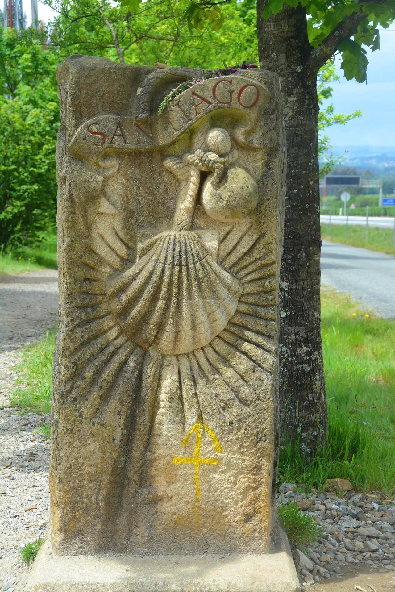 조가비와 표주박이 새겨진 산티아고 가는 길의 오래된 돌 표지석