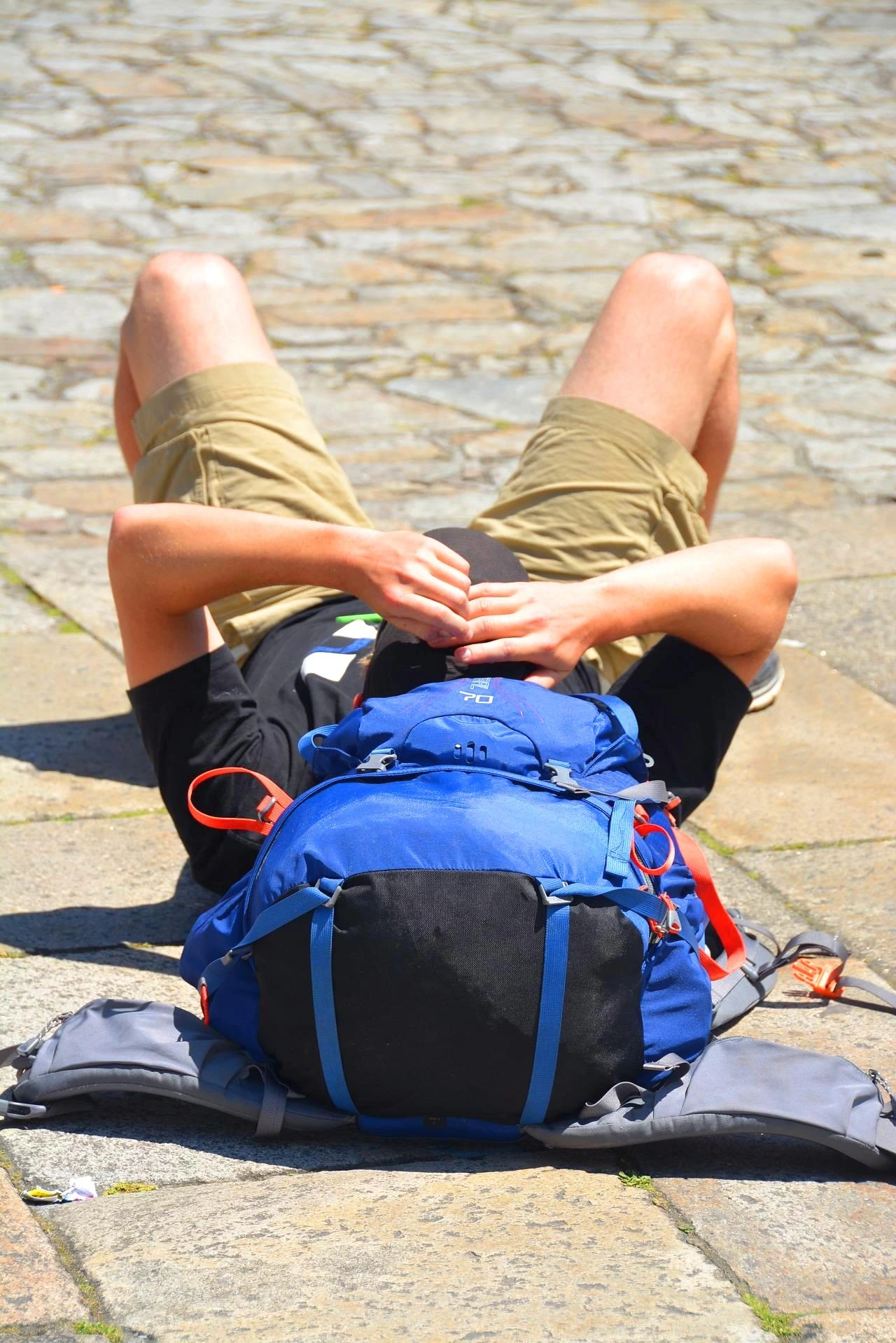 맑은날 산티아고 대성당 앞에 대자로 드러 운 순례자들