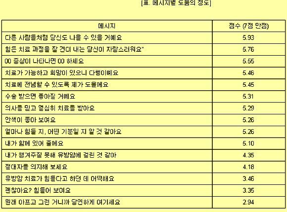 최근 유방암 환자 200여명을 대상으로 투병 기간 중 가족이나 주변인들로부터 많이 듣는 위로의 말이 얼마나 도움이 되는조사하고, 그 결과를 발표했다