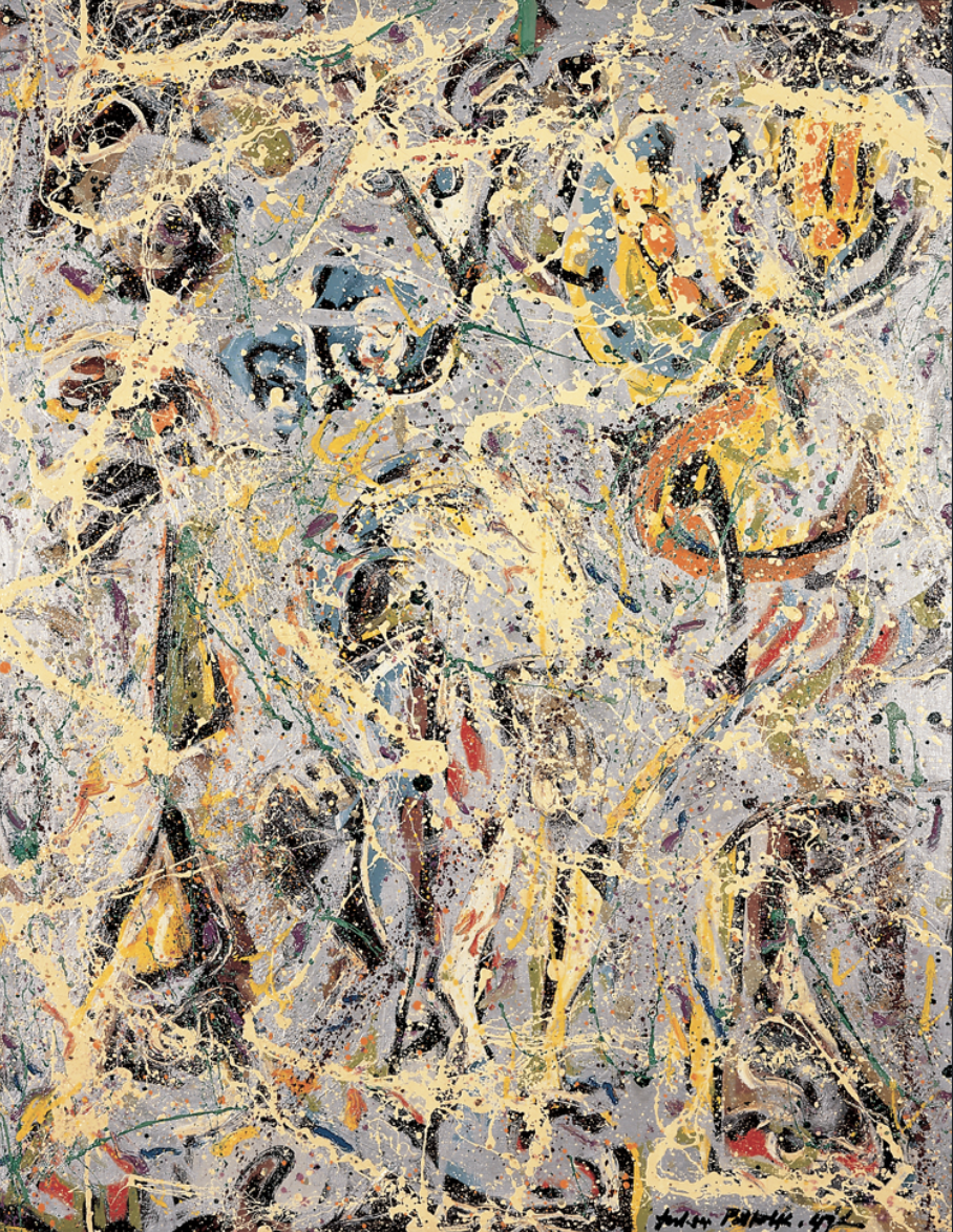 벽 한면을 꽉 채울 커다란 화폭에 거침없이 휘갈긴 붓자국들이 보이시죠? 저런 그림이 사람 키보다 더 큰 캔버스에 6미터나 되는 길이로 펼쳐져 있는 것을 직접 보면 무슨 느낌일까요? 어떤 느낌이든지 여튼 되게 크게, 많이 느껴질 것 같습니다. 이건 페기 구겐하임이 잭슨 폴록에게 직접 주문한 그림입니다. 처음에는 자기 집에 들일 벽화로 주문할 생각이었는데, 페기에게 항상 예술에 관한 조언을 주던 마르셸 뒤샹이, 나중에 다른 곳에 전시하기도 좋게 캔버스에 그리도록 주문하라고 귀띔을 해 주었다죠.