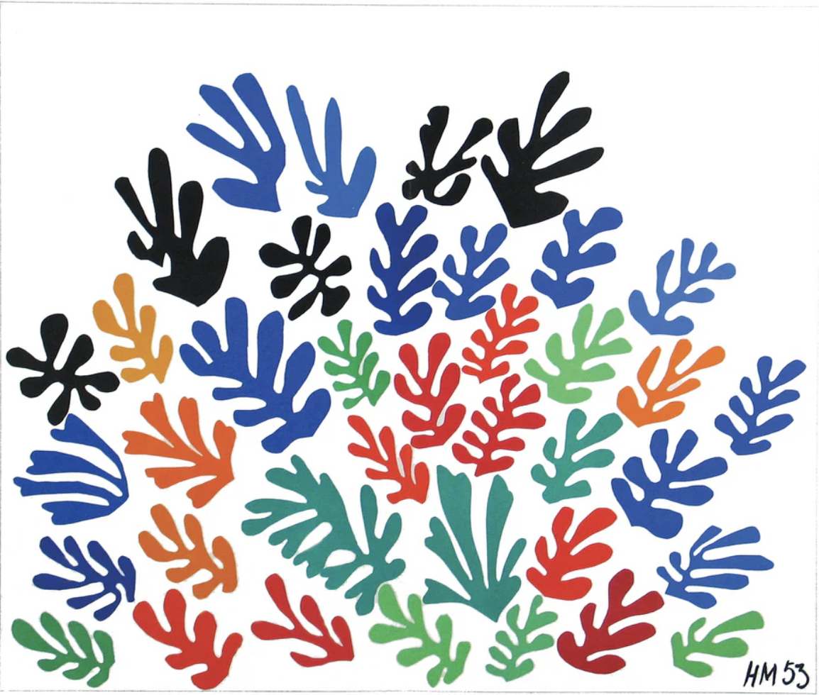 여튼, 마티스는 점점 심플한 형태의 스타일을 발전시켜 나갔고, 여러분도 잘 알다시피 노년에는 몸이 병들어 침대에서 일어날 수 없을 때에도 채색된 종이들을 가위로 잘라 작품을 만들었습니다.