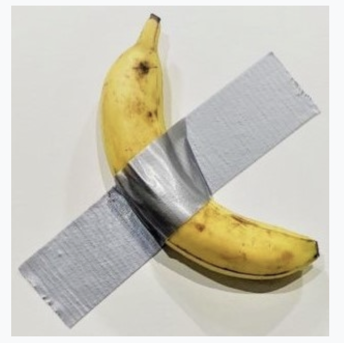 이렇게 내뱉으며 휙 지나가도 상관 없겠지만, 혹시 2024년 말에 바나나 하나를 테이프로 벽에다가 떡 하니 붙인 작품이 6백만 달러도 넘는 가격에 팔렸다는 기사 읽으신 적 있나요? 그 비싸고 귀하신 몸이 바로 아래의 작품 <코미디언>입니다. 단순히 바나나만 붙인 것은 아니고, 올바른 전시를 위한 상세한 도안과 지침, 그리고 이것이 진품이라는 증명서와 함께 구성된 작품이라는군요.