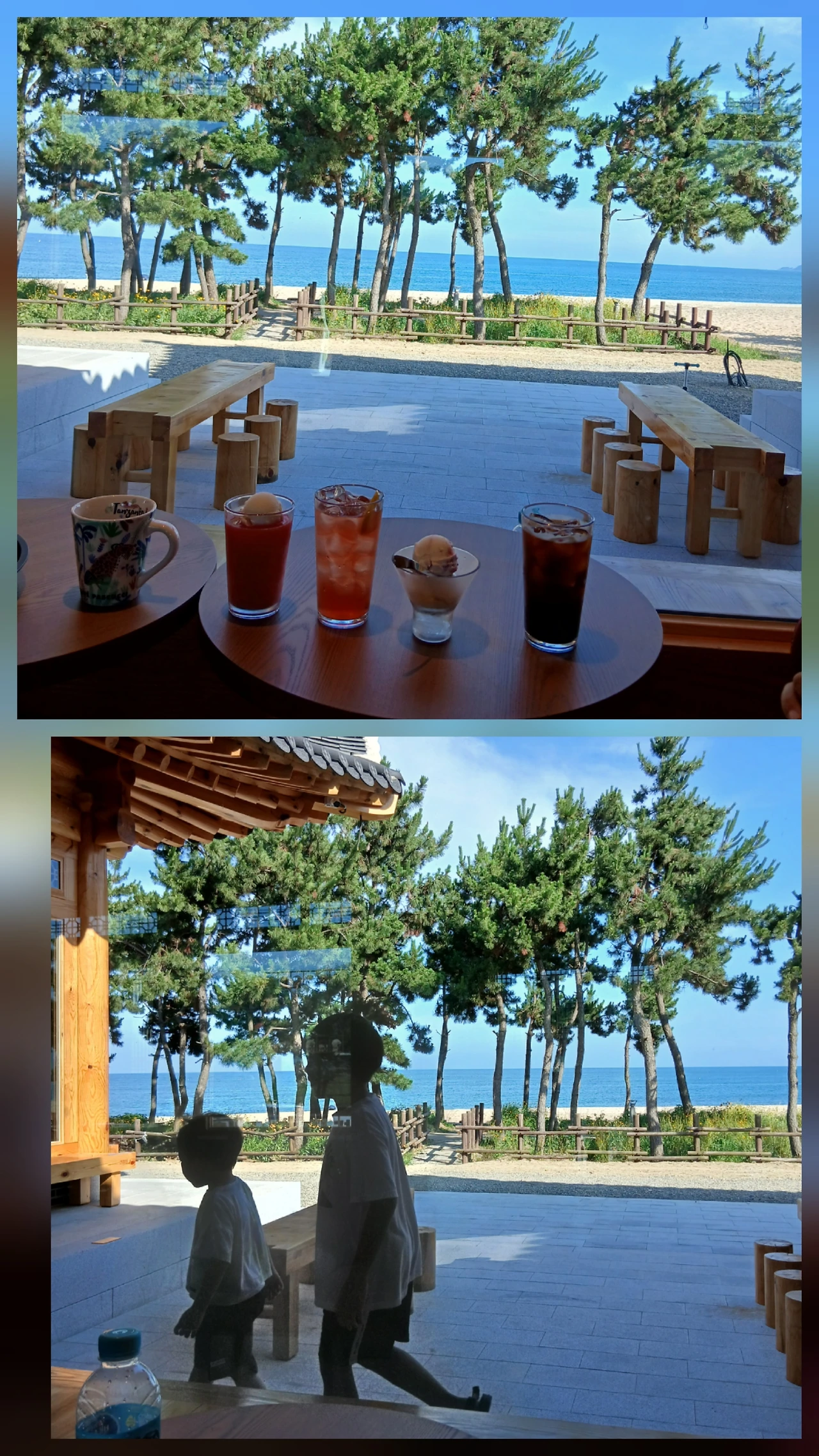 지난번 왔을 땐 없었던 나무골조로 잘 지어진 기와건물이 보였다. 바다와 솔밭의 뷰맛이 일품인 자리에 파스쿠찌 카페가 생긴 거다. (못 보고 그냥 갔으면 어쩔뻔했나...)