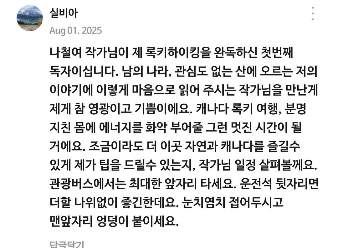 브런치에서 글벗으로 안 지 얼마 되지 않았지만 금세 친해져 버린 실비아작가님도 우리 여행의 동반자 같았다. 이미 세 권의 브런치북을 통해 로키산맥에서 만큼은 선구자 역할을 해 준 실비아작가님은 소중한 인연이다.