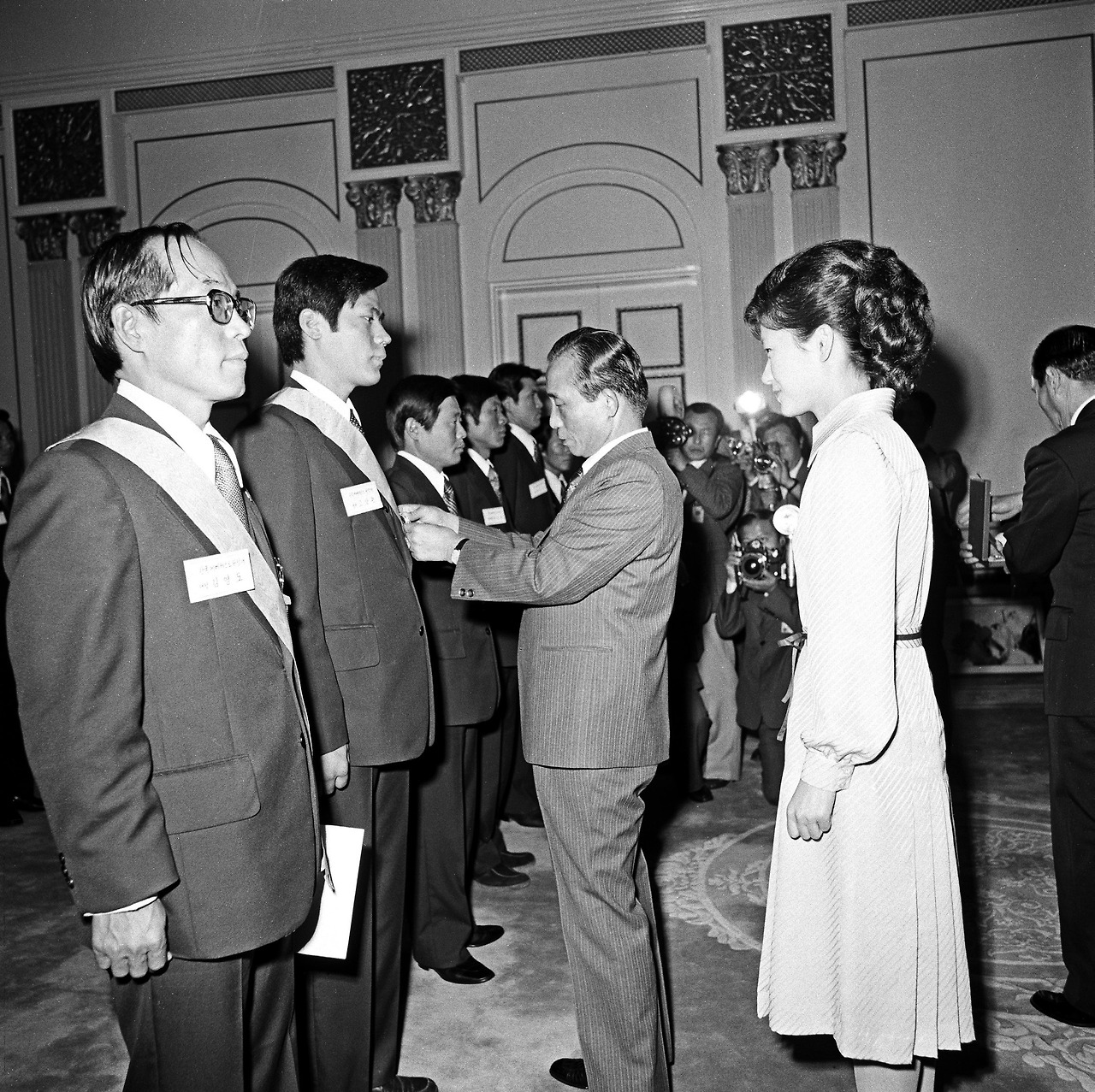 부녀간 정담을 나누고 있는 박정희 대통령, 박정희 대통령 에베레스트 등반대원에게 훈장 수여, 출처: e영상역사관