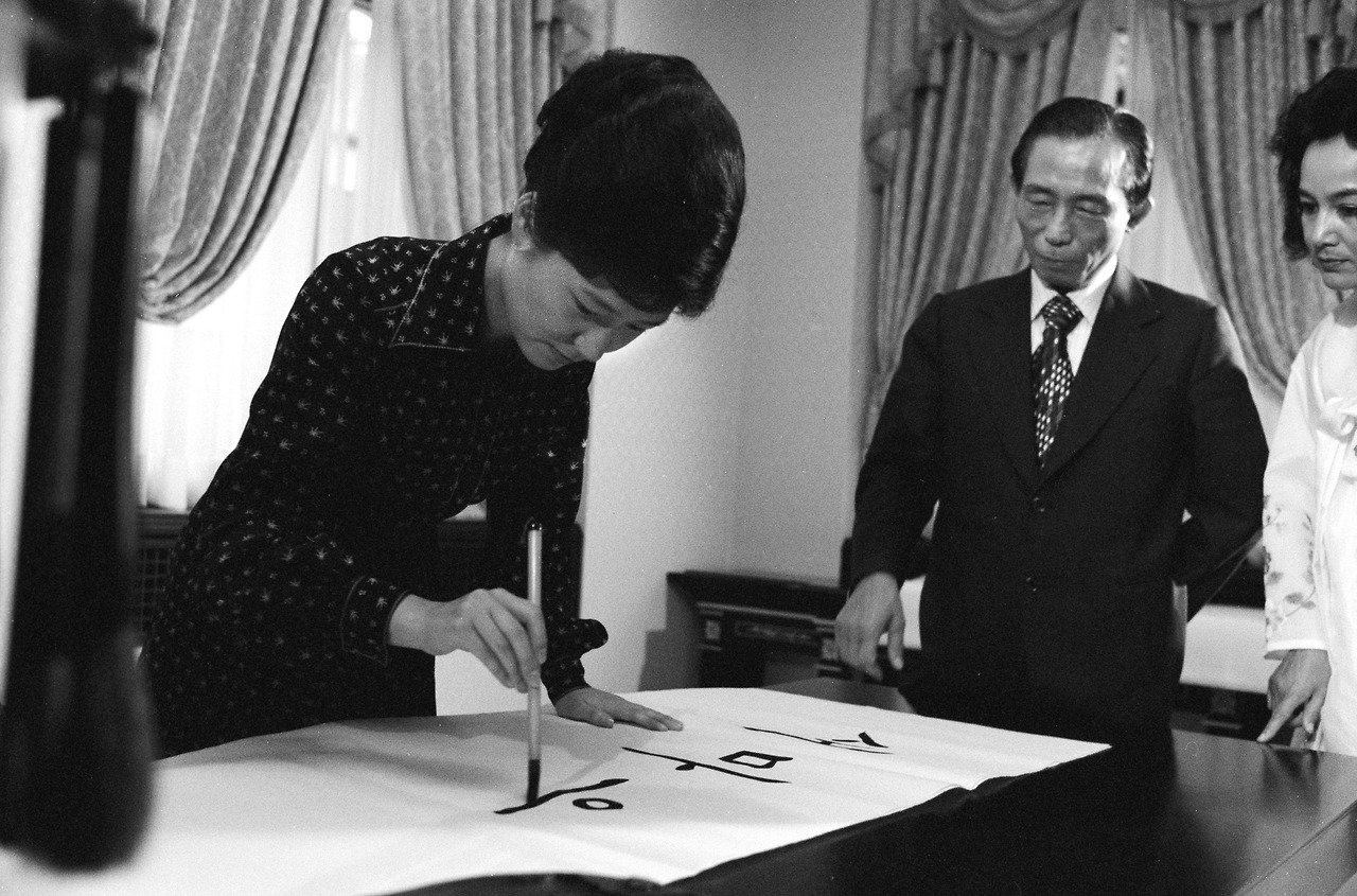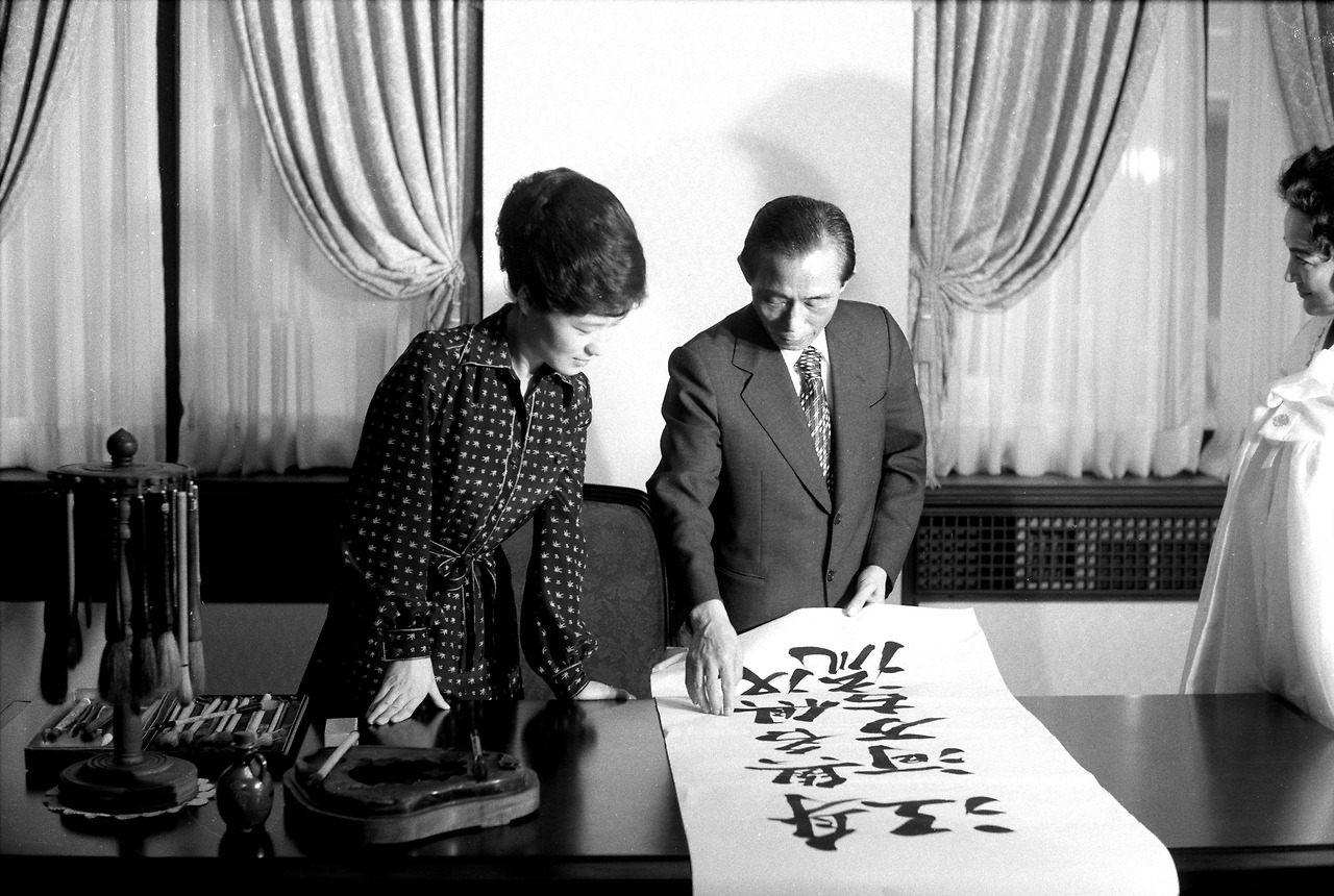 서예 학습 중인 장녀 근혜양, 서예 학습 직후 박정희 대통령과근혜 양, 출처: e영상역사관