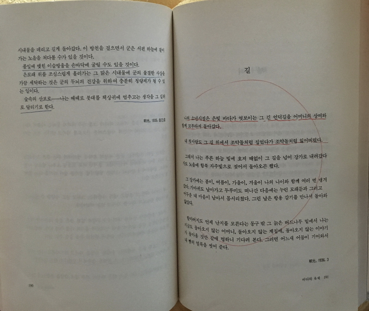 다른 작품을 읽기 전에 <길> 먼저 찾았다. 단 한 장의 글. 그게 전부였다. 그 길 뒤에 또 다른 길이 이어질 줄 알았는데 거기서 길이 끝나고 말았다. 마치 내가 북으로 끌려가며 더 이상 건널 수 없는 선 앞에 와 있는 기분이었다. 그 작품을 다시 읽었다. 신문에 원래 실렸던 글과는 차이가 있었다. 1992년 맞춤법으로 다시 옮긴 글이었다. 발표할 당시 원문이 훨씬 더 진실하게 다가왔다. 빨간 펜으로 물결선이 행마다 그어져 있고 동그라미로 크게 쳐져 있었다. 이 책을 읽었던 주인도 이 작품이 좋았던 것이다. 헌 책은 이런 맛이 있다. 누군가와 같이 읽는 듯한 느낌. 그책을 읽었을 시간을 공유하고 같은 온도를 경험하는 느낌.