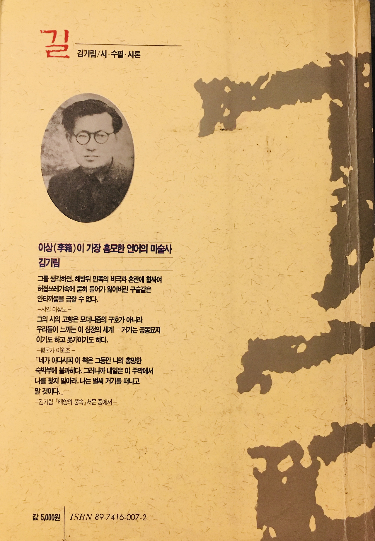 시 수필 시론이라고 되어 있고 김기림이 크게 인쇄되어 있었다. 뒷면에는 김기림의 사진이 실려 있고 '이상이 가장 흠모한 언어의 마술사'라는 표사가 실렸다. 그 아래 ‘김기림 그를 생각하면 해방 뒤 민족의 비극과 혼란에 휩싸여 허접쓰레기 속에 묻혀 들어가 잃어버린 구슬 같은 안타까움을 금할 수 없다’고 시인 이상노가 적었다. 뒷장을 넘겼더니 둥그리고 활달한 한문 글씨체로 사인이 되어 있었다. 처음 책을 산 주인일터다.