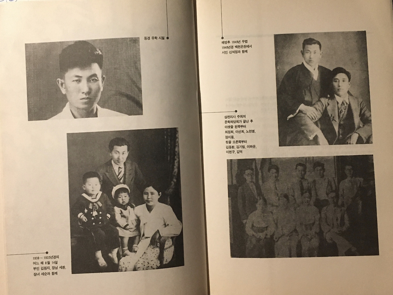 책을 넘겼다. 책날개에 김기림의 동경 유학 시절 젊은 사진이 실려 있었다. ‘1908년 함북 학성에서 태어나 1930년 일본 대학 문학예술과를 거쳐 동북제대 영문화를 졸업하고 조선일보 기자생활을 하면서 본격적인 작품 발표를 시작하였다...’는 작가 소개가 있었다. 그의 사진 몇 장도 실려 있었다. 아기들과 찍은 가족사진, 신석정과 찍은 사진. 최정희, 노천명, 김동환, 이헌구, 김억 같은 문우들과 찍은 사진이 있었다.