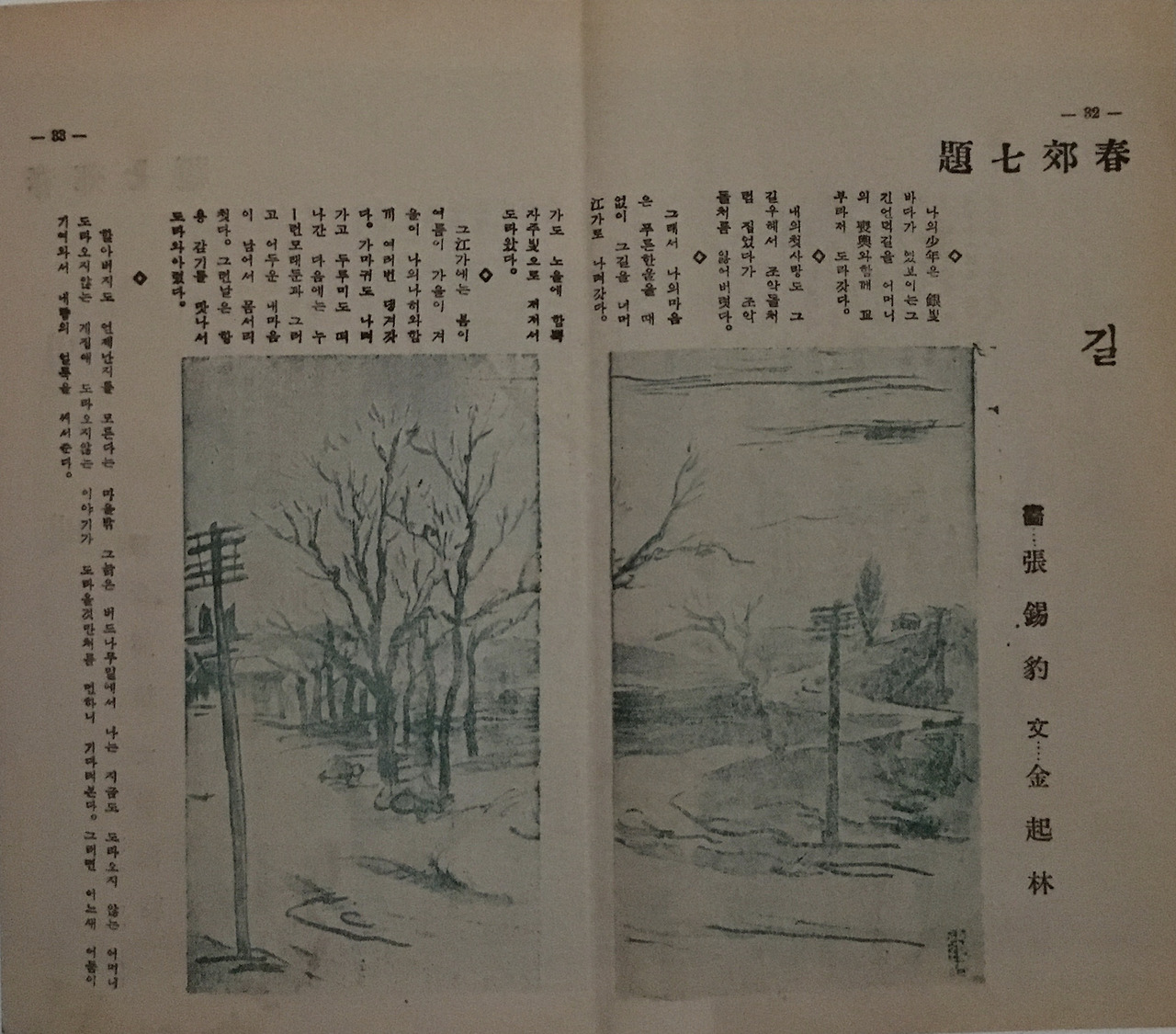 전시에 다녀오고 나서 도록을 샀다. 개인 소장인데다 쉽게 볼 수 없는 것들이기도 하고 전시에서 다 보지 못한 것들을 더 자세히 보고 싶기도 했다. 제일 먼저 <길>을 펼쳤다. 그 글은 1936년 조광 2권 제3호에 실린 글이다. 세로 쓰기로 된 3포인트 정도 작은 글씨로 된 그 시화다. 김기림의 글에 장석표가 그림을 그렸다. 고목이 있는 돌아가는 길. 전신주가 서 있고 눈이 묻은 길에는 인적이 없다. 고요한 길은 구불구불 돌아가고 나목 몇 그루가 떨고 서 있다. 싸늘한 겨울바람이 지나는 풍경이다.